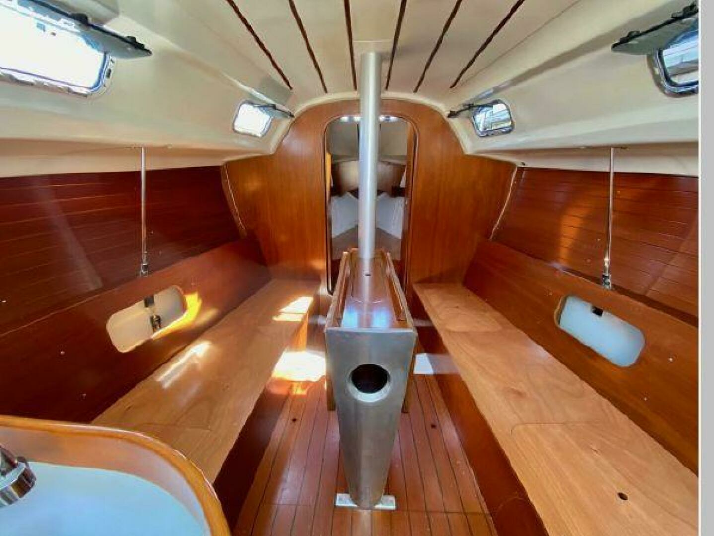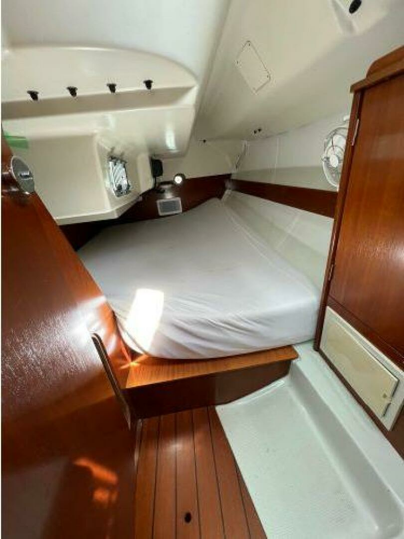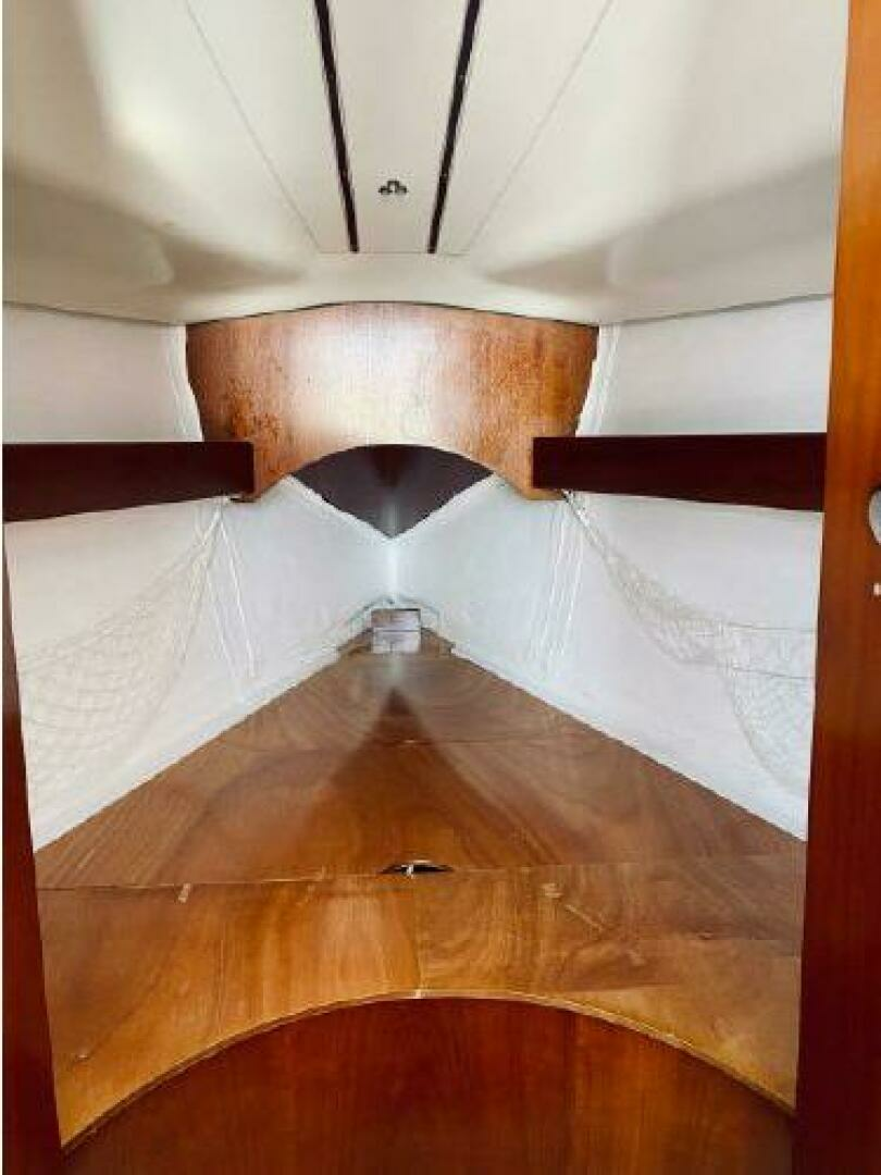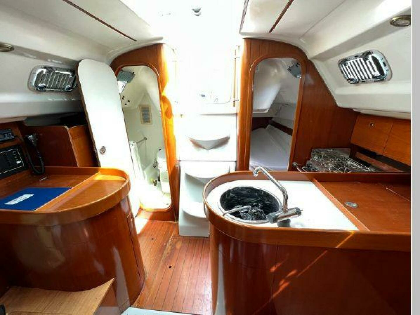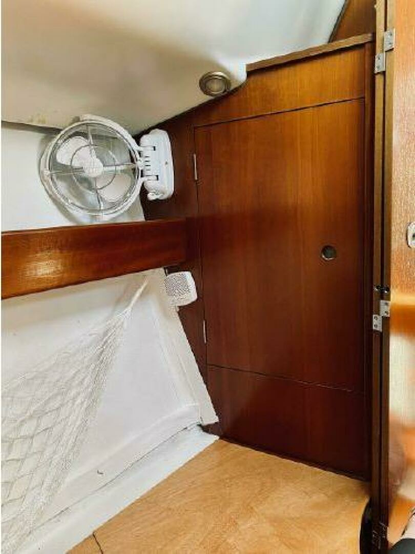 - Below and starting forward is the first stateroom with V-berth, locker and overhead hatch. Next is the main salon with port and starboard settees with shelving outboard and a fixed centerline table with drop leaves. On starboard and aft of the settee is a large ice box, electric panel, hanging locker, followed by her large head with vanity, toilet and shower. To port and aft of the settee is her L-shaped galley followed by her aft stateroom with locker and huge berth with opening ports for ventilation. Engine access is via the companionway steps. One will see from the pictures her lovely Cherry joinery with ceiling strips that line the hull help to make her interior warm and inviting.
