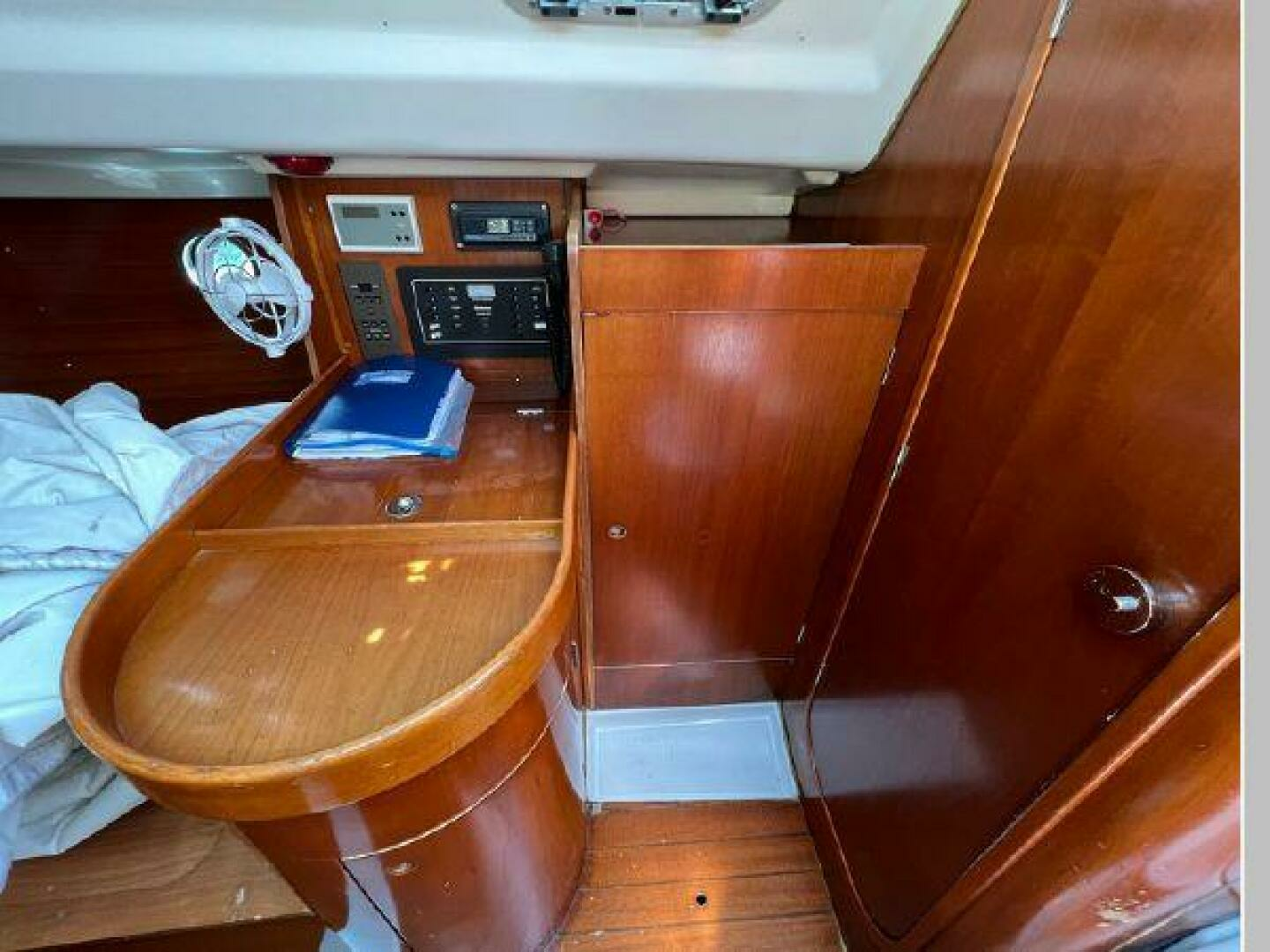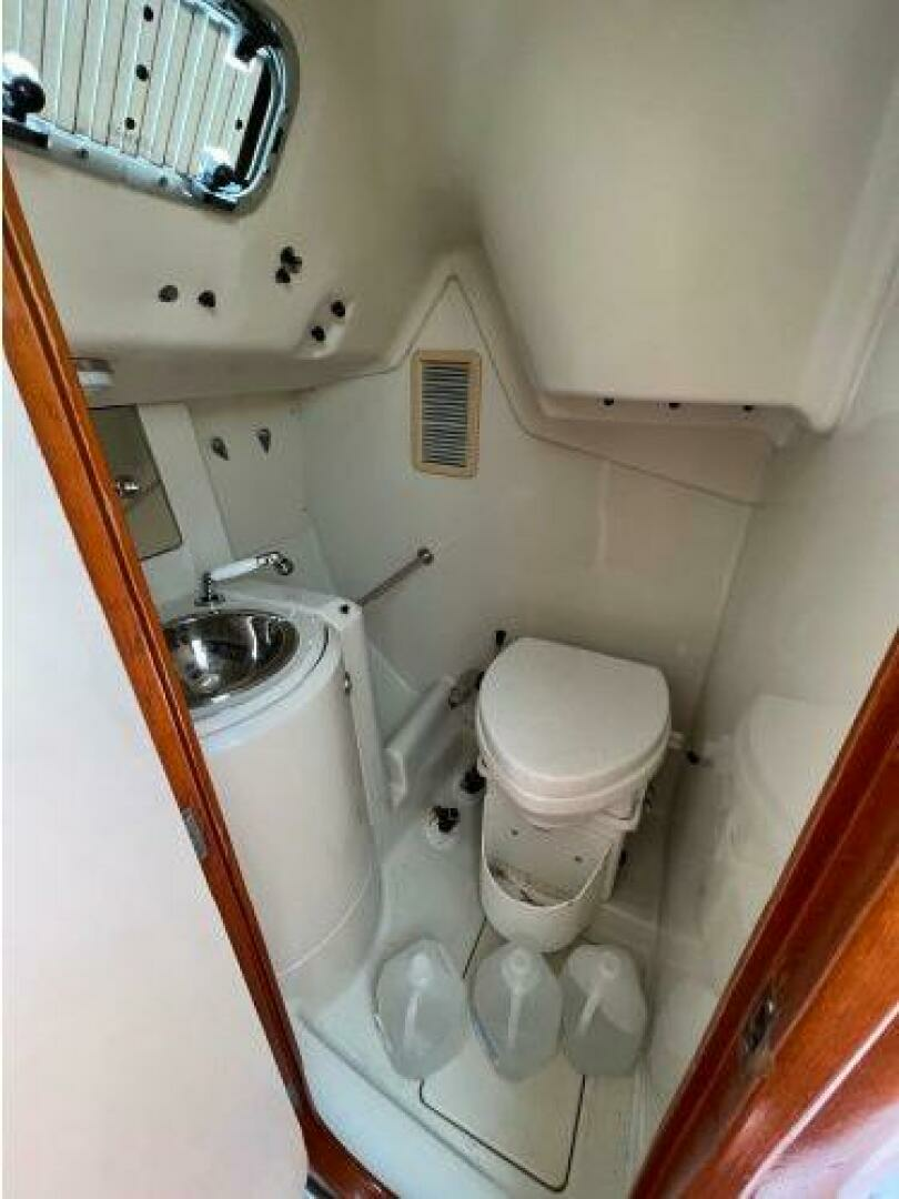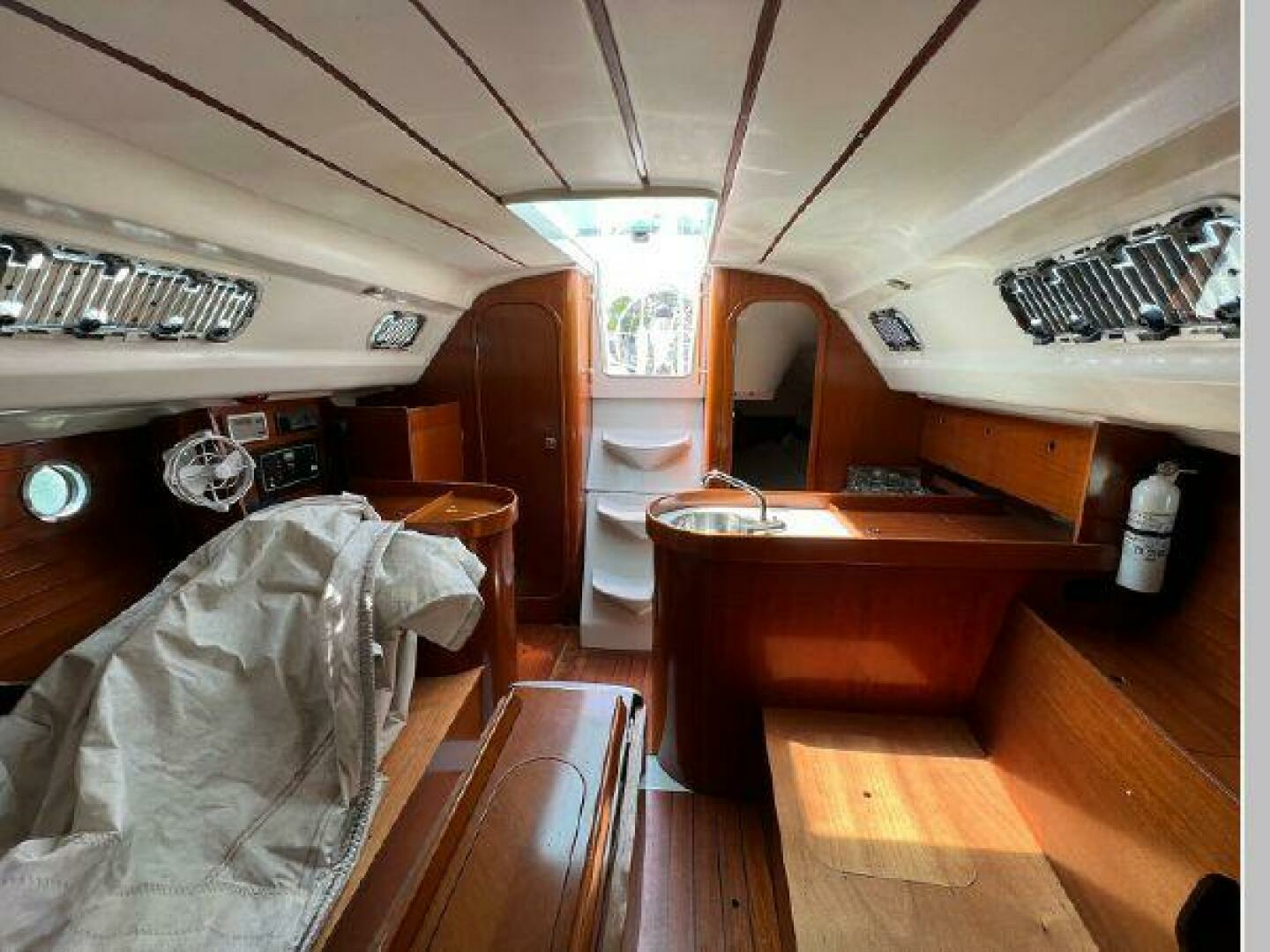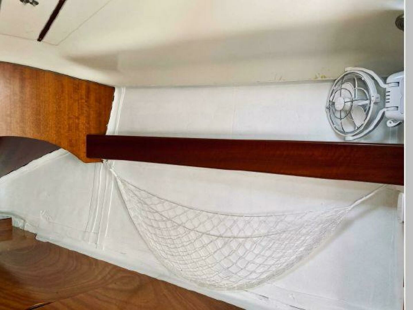 - Below and starting forward is the first stateroom with V-berth, locker and overhead hatch. Next is the main salon with port and starboard settees with shelving outboard and a fixed centerline table with drop leaves. On starboard and aft of the settee is a large ice box, electric panel, hanging locker, followed by her large head with vanity, toilet and shower. To port and aft of the settee is her L-shaped galley followed by her aft stateroom with locker and huge berth with opening ports for ventilation. Engine access is via the companionway steps. One will see from the pictures her lovely Cherry joinery with ceiling strips that line the hull help to make her interior warm and inviting.