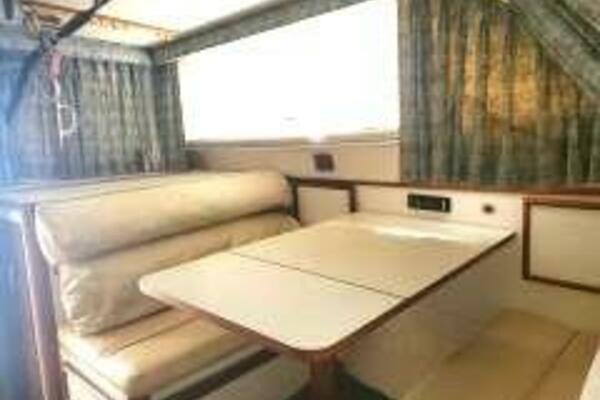 - The flybridge offers great visibility and includes a bench seat and helm chairs.