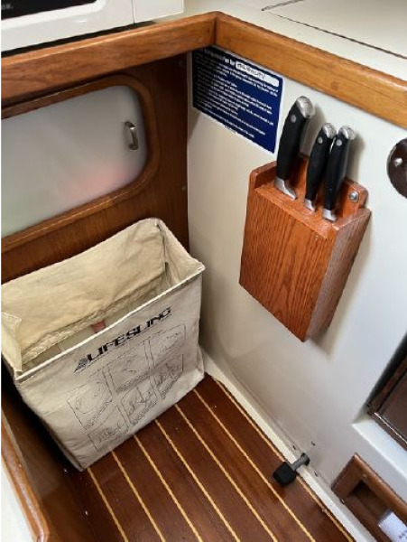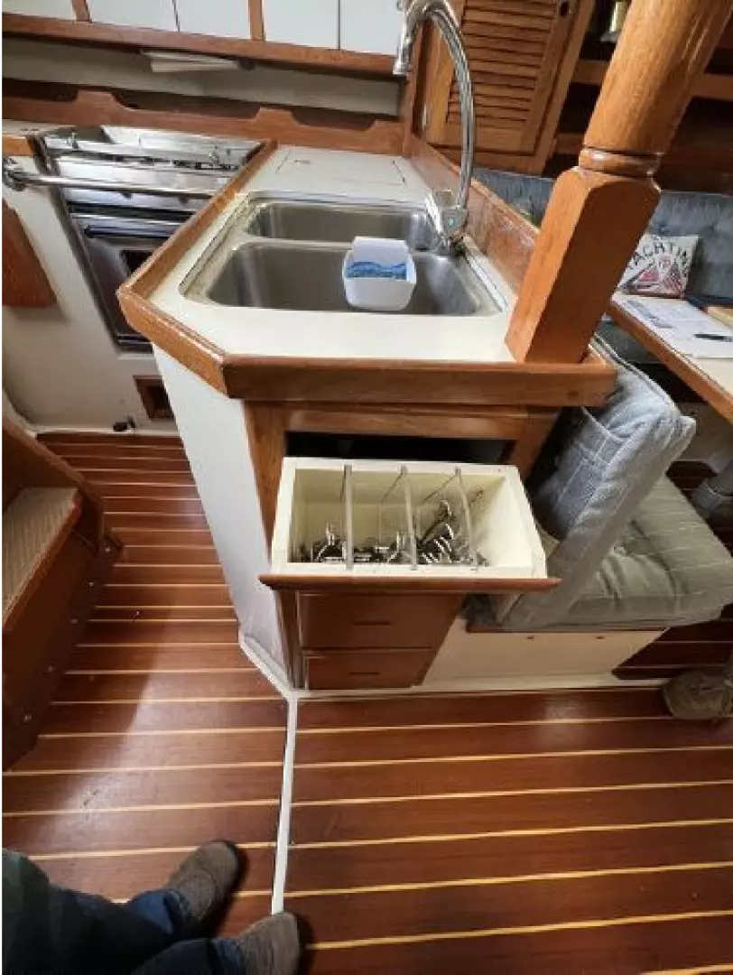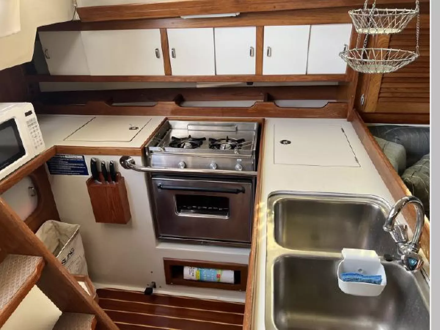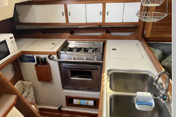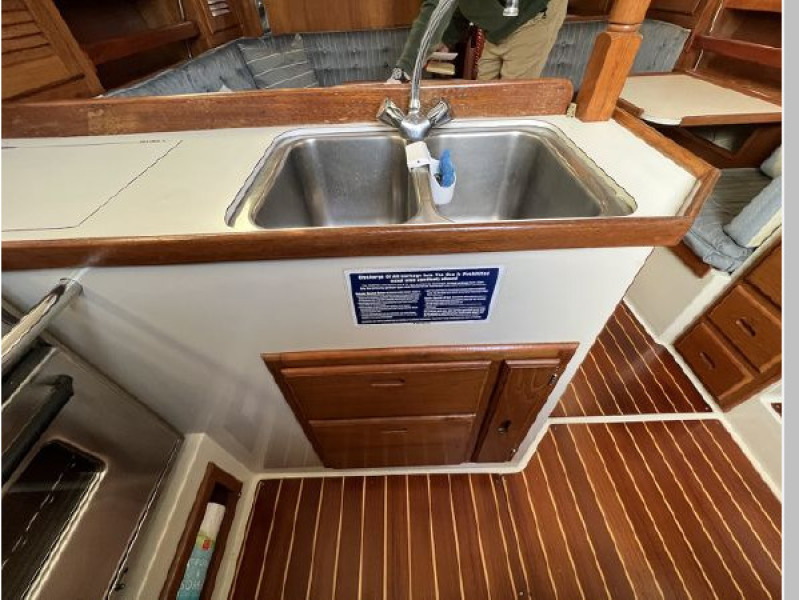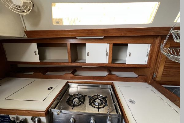 The galley is considered a U-shaped Sea Galley with composite counter tops and sinks that are neat centerline for proper drainage underway. There is enough cabinet space to stock provisions for extended cruising. Tons of counter space make meal prep a pleasure while underway or at anchor.