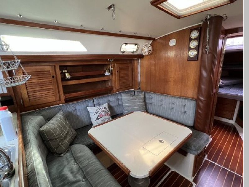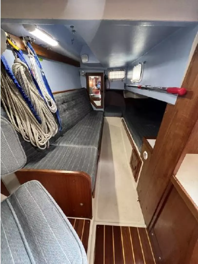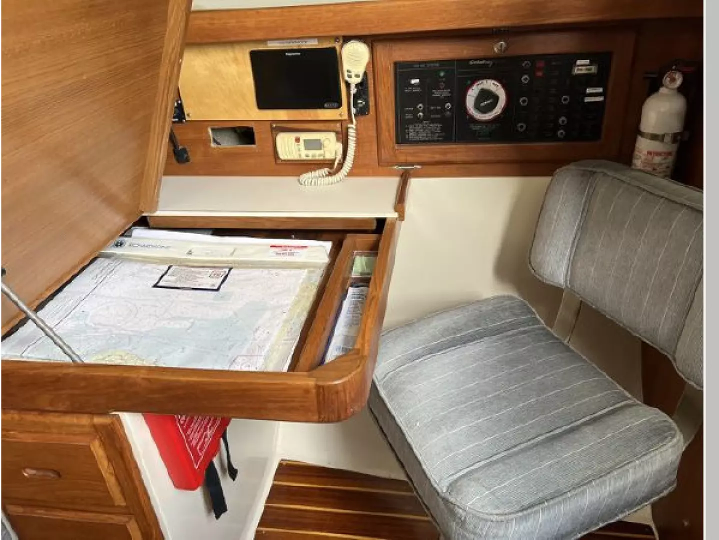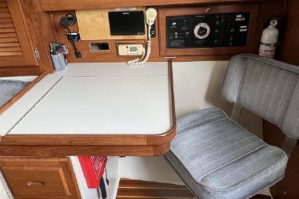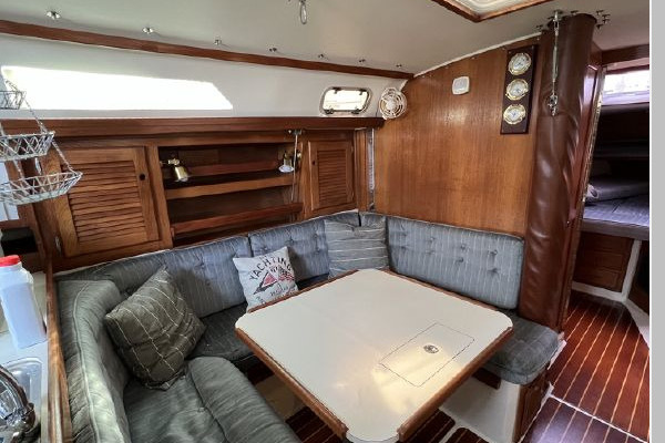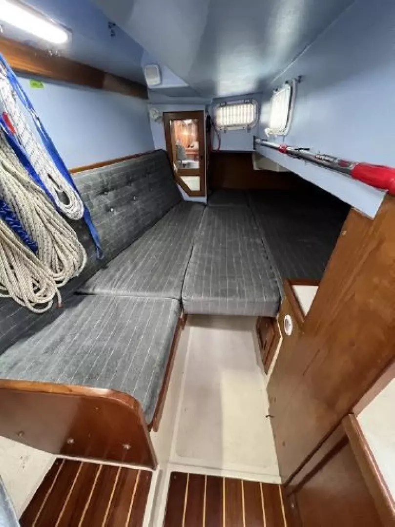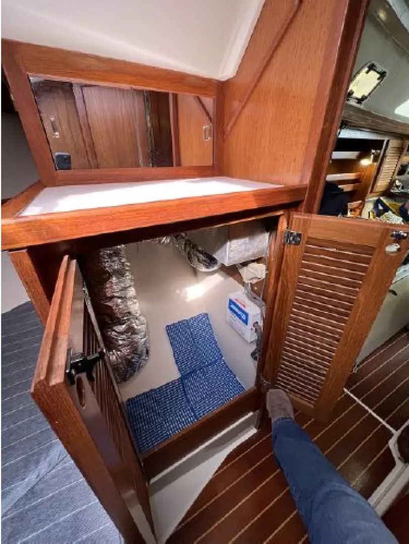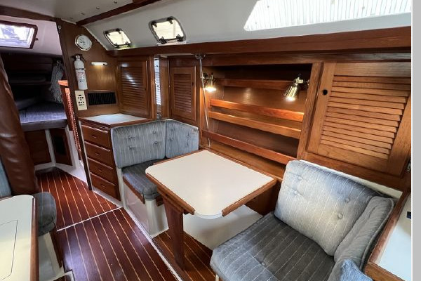 As one enters the cabin you immediately notice the warm varnished teak cabinetry and bulkheads coupled by the soft blue tufted cushions, cozy seating accommodations and beautiful teak and holly sole. The master cabin is forward and offers a V-berth with filler, hanging locker, overhead hatch for excellent light and ventilation, v-berth hammocks on either side for additional storage. Moving aft to port is the large head compartment with vanity, toilet, shower, overhead hatch and teak grate on the floor. Opposite to starboard is the hanging locker, outboard cabinet for liquor storage, counter top and drawers under. The salon has a large U-shaped dinette to port with hi/low table so as one can convert for an additional berth. To starboard there are two seats and game table that can convert to a settee or berth with the additional cushions. There are ample drawers, open and closed lockers and bins for all your cruising provisions and gear. Aft of the dinette on port is the large U-shaped sea galley. Opposite to starboard is a true navigation station with swivel chair, flip up desk for map storage and battery switch and electronics outboard. Aft of the Navigation station is a huge aft cabin. Some may prefer this area as the master stateroom. Here too, there is a settee outboard and double inboard, with the filler makes for a tremendous berth or utilize the space for additional storage. There are plenty of opening ports and hatches for excellent light and ventilation thru out the vessel. Centerline companionway leads to her spacious cockpit and the engine access is under the steps.