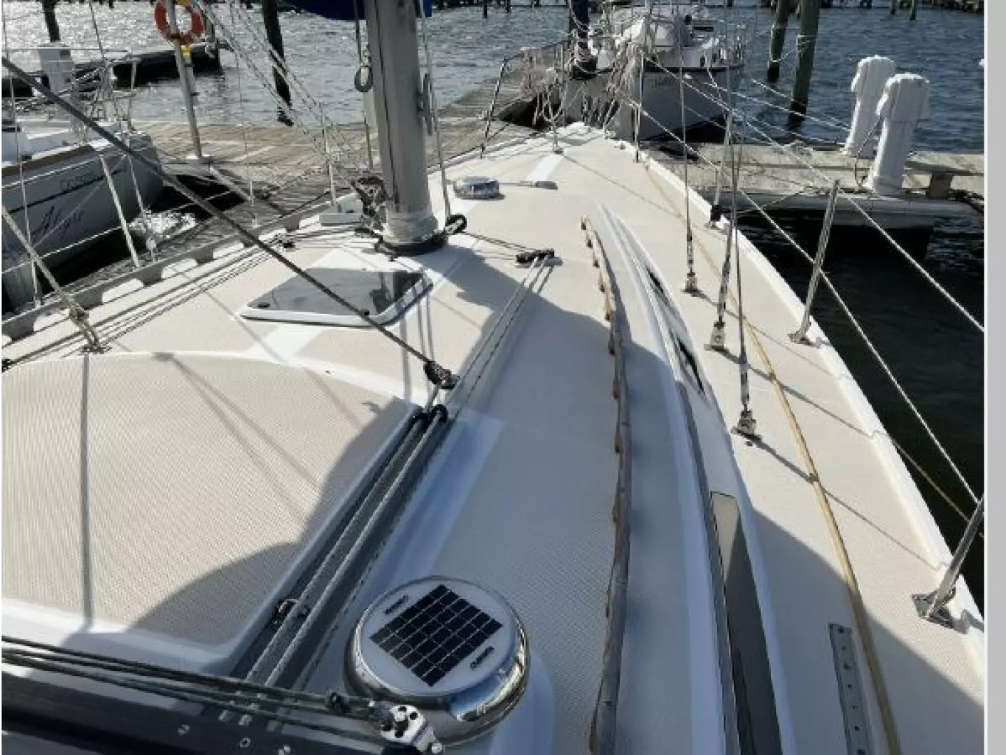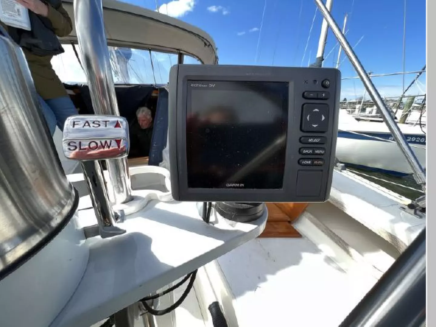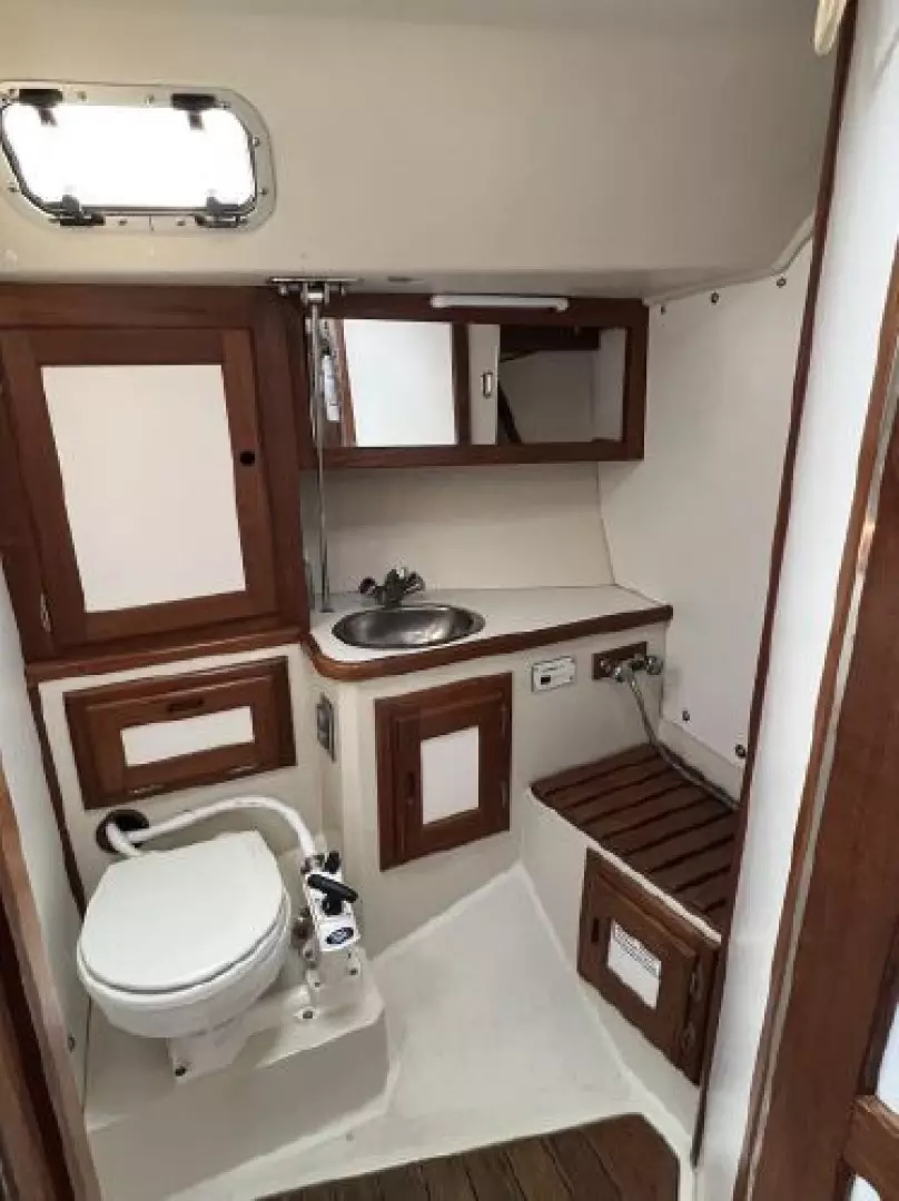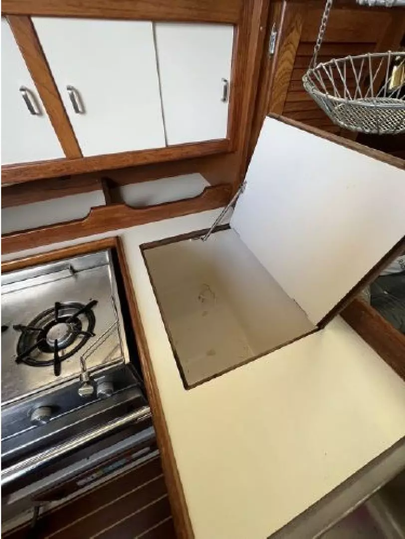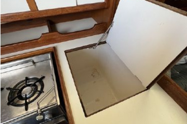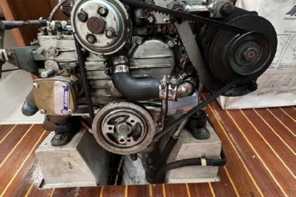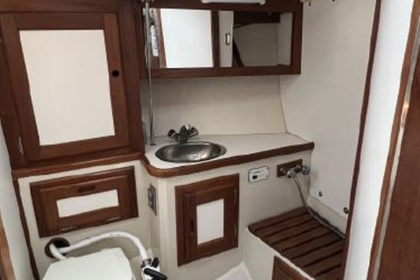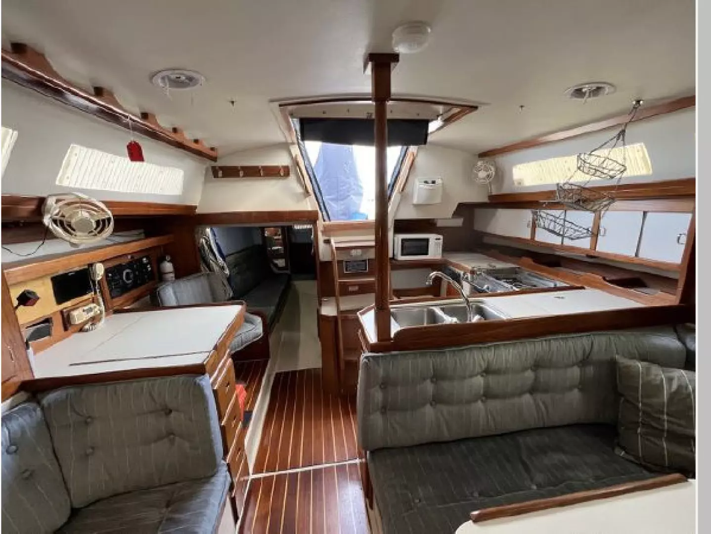 As one enters the cabin you immediately notice the warm varnished teak cabinetry and bulkheads coupled by the soft blue tufted cushions, cozy seating accommodations and beautiful teak and holly sole. The master cabin is forward and offers a V-berth with filler, hanging locker, overhead hatch for excellent light and ventilation, v-berth hammocks on either side for additional storage. Moving aft to port is the large head compartment with vanity, toilet, shower, overhead hatch and teak grate on the floor. Opposite to starboard is the hanging locker, outboard cabinet for liquor storage, counter top and drawers under. The salon has a large U-shaped dinette to port with hi/low table so as one can convert for an additional berth. To starboard there are two seats and game table that can convert to a settee or berth with the additional cushions. There are ample drawers, open and closed lockers and bins for all your cruising provisions and gear. Aft of the dinette on port is the large U-shaped sea galley. Opposite to starboard is a true navigation station with swivel chair, flip up desk for map storage and battery switch and electronics outboard. Aft of the Navigation station is a huge aft cabin. Some may prefer this area as the master stateroom. Here too, there is a settee outboard and double inboard, with the filler makes for a tremendous berth or utilize the space for additional storage. There are plenty of opening ports and hatches for excellent light and ventilation thru out the vessel. Centerline companionway leads to her spacious cockpit and the engine access is under the steps.
