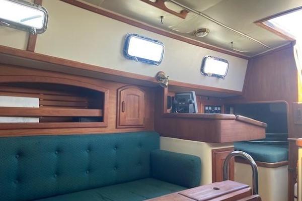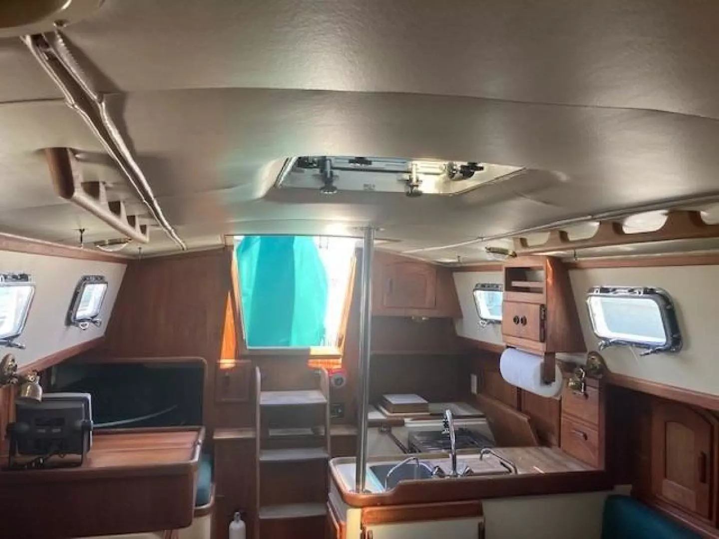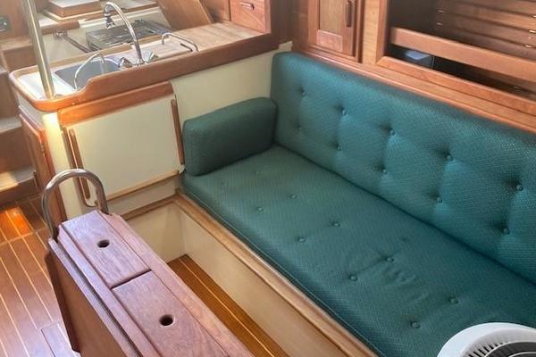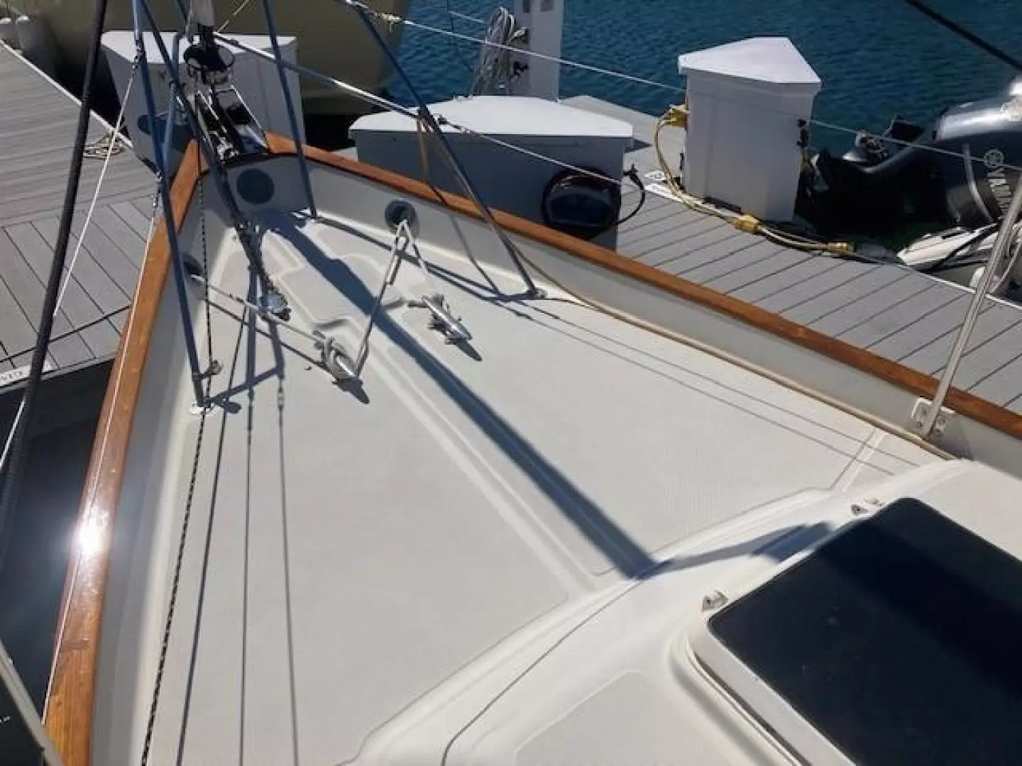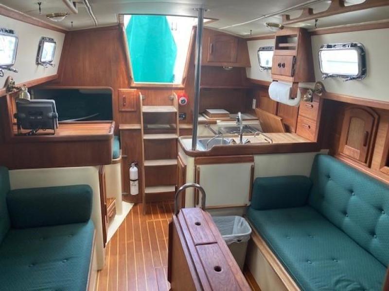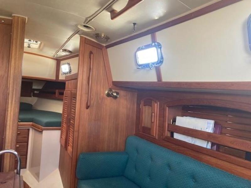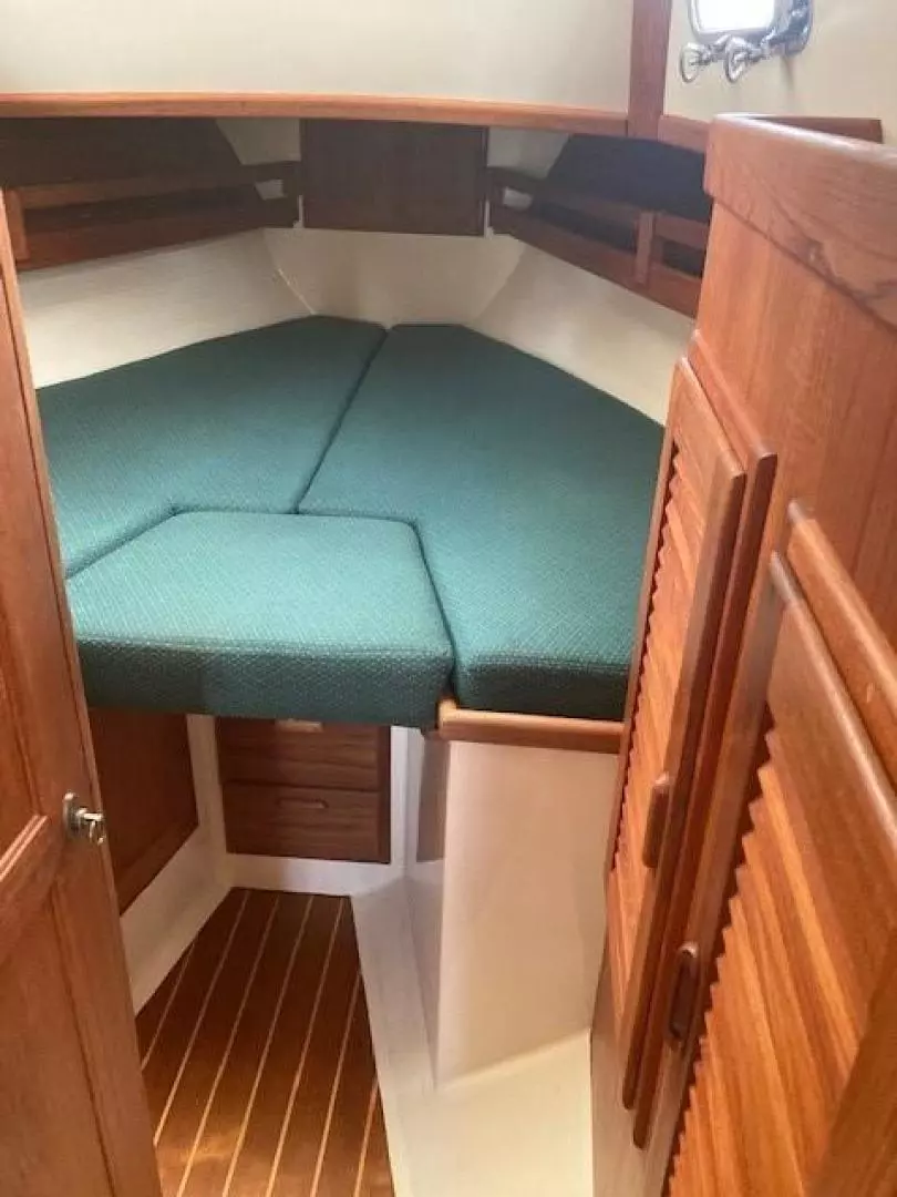 The layout is that of a traditional offshore cruiser. Staring forward she features a master's cabin with a large V-berth that coverts to a double with the insert in place. There is storage space below the berths, shelves above them along the hull sides and a hanging locker aft to starboard. To port is the head compartment with storage lockers above and below the sink, a molded shower pan, teak framed mirror and a marine toilet., Next aft is the traditional main salon with port and starboard settees. The port settee can convert to a double berth. Above and outboard of both settees are teak storage lockers and bookshelves removable fiddles to keep your ship's library in place. There is a large centerline drop leaf table. The bulkheads are solid teak and the cabin sole is varnished teak and holly. Further aft to starboard is the nav station with a chart table with al lift up lid for storage of charts and navigation items. The ship's hinged electrical panel is also located here. Below the chart table is a wet locker. Aft of the nav station is the quarter berth, the forward end of which serves as the navigator's seat.