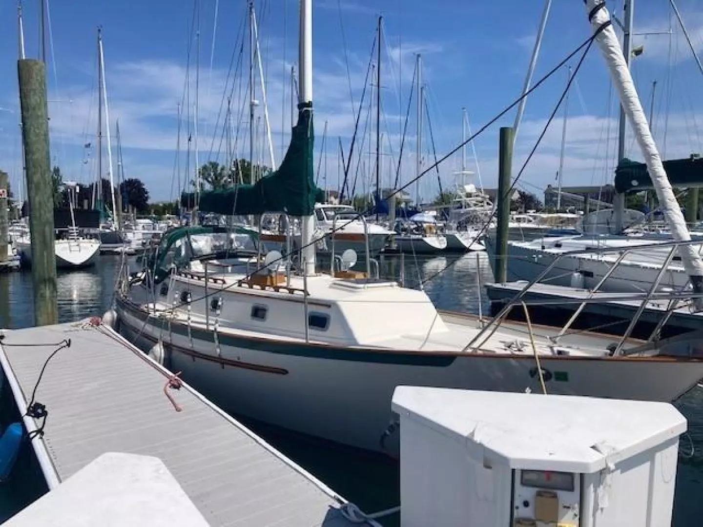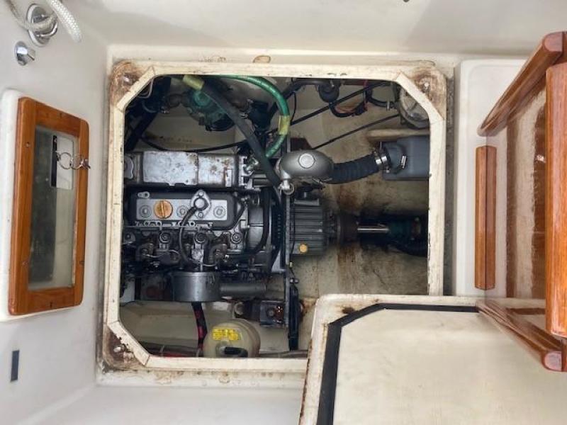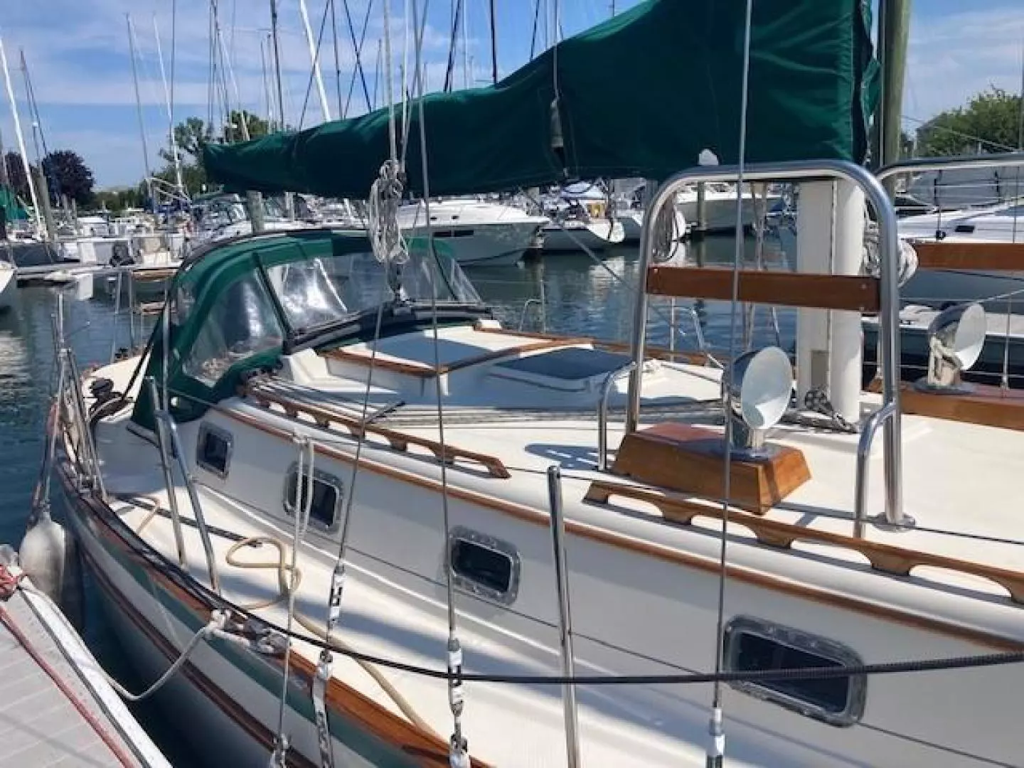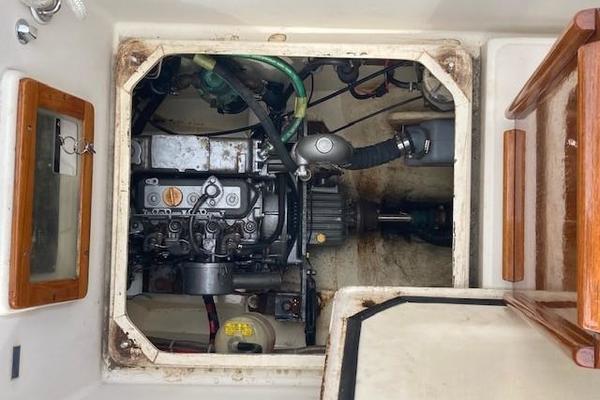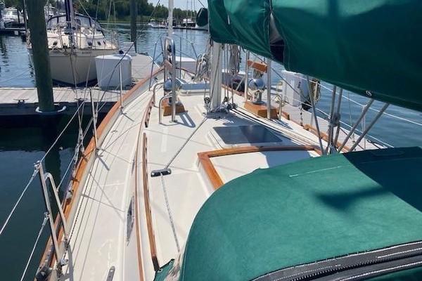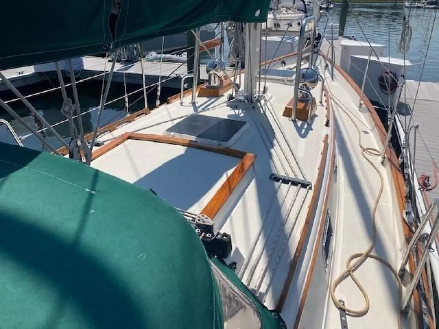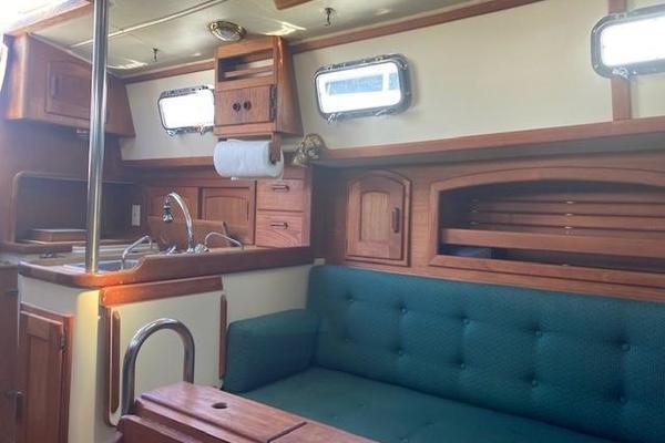 The layout is that of a traditional offshore cruiser. Staring forward she features a master's cabin with a large V-berth that coverts to a double with the insert in place. There is storage space below the berths, shelves above them along the hull sides and a hanging locker aft to starboard. To port is the head compartment with storage lockers above and below the sink, a molded shower pan, teak framed mirror and a marine toilet., Next aft is the traditional main salon with port and starboard settees. The port settee can convert to a double berth. Above and outboard of both settees are teak storage lockers and bookshelves removable fiddles to keep your ship's library in place. There is a large centerline drop leaf table. The bulkheads are solid teak and the cabin sole is varnished teak and holly. Further aft to starboard is the nav station with a chart table with al lift up lid for storage of charts and navigation items. The ship's hinged electrical panel is also located here. Below the chart table is a wet locker. Aft of the nav station is the quarter berth, the forward end of which serves as the navigator's seat.