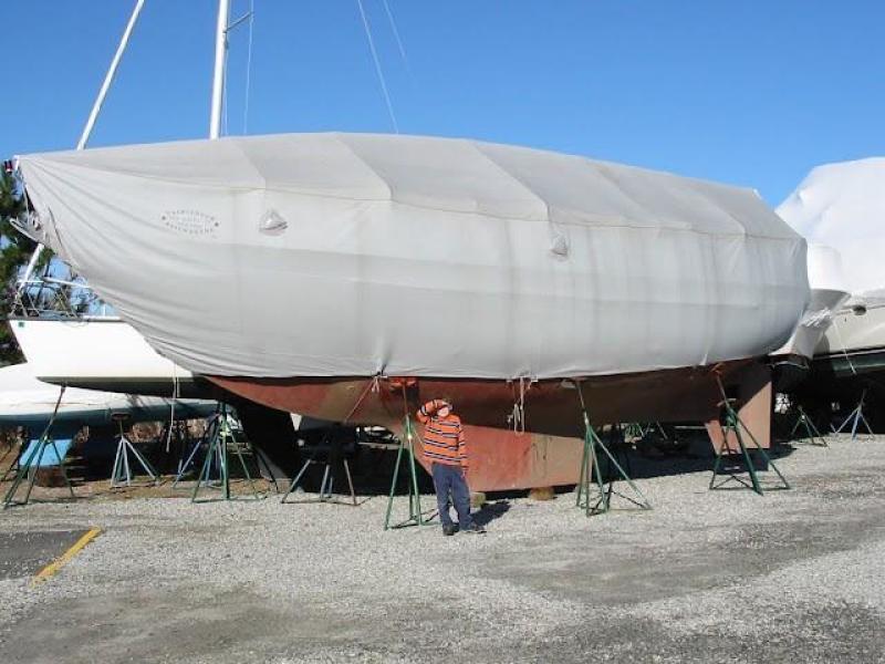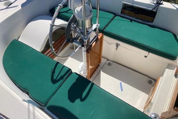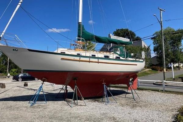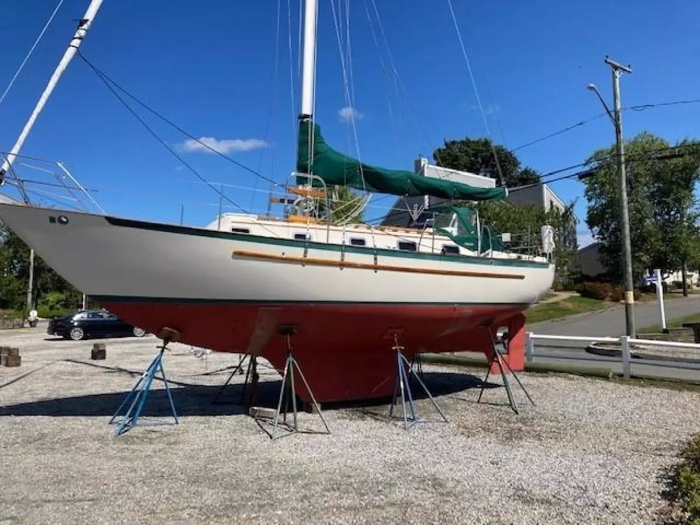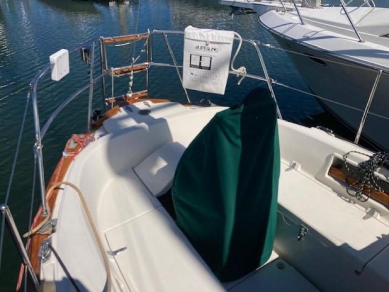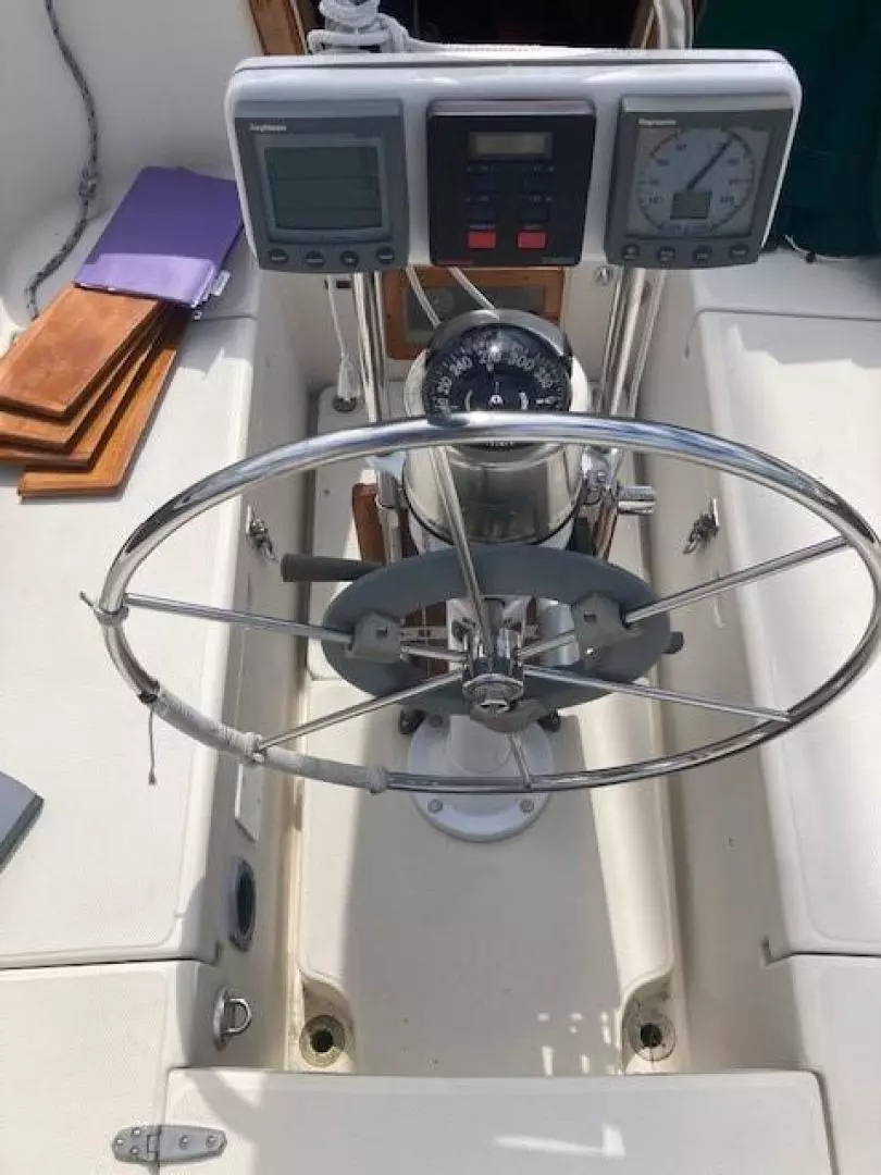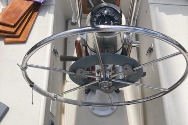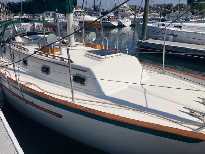 The layout is that of a traditional offshore cruiser. Staring forward she features a master's cabin with a large V-berth that coverts to a double with the insert in place. There is storage space below the berths, shelves above them along the hull sides and a hanging locker aft to starboard. To port is the head compartment with storage lockers above and below the sink, a molded shower pan, teak framed mirror and a marine toilet., Next aft is the traditional main salon with port and starboard settees. The port settee can convert to a double berth. Above and outboard of both settees are teak storage lockers and bookshelves removable fiddles to keep your ship's library in place. There is a large centerline drop leaf table. The bulkheads are solid teak and the cabin sole is varnished teak and holly. Further aft to starboard is the nav station with a chart table with al lift up lid for storage of charts and navigation items. The ship's hinged electrical panel is also located here. Below the chart table is a wet locker. Aft of the nav station is the quarter berth, the forward end of which serves as the navigator's seat.