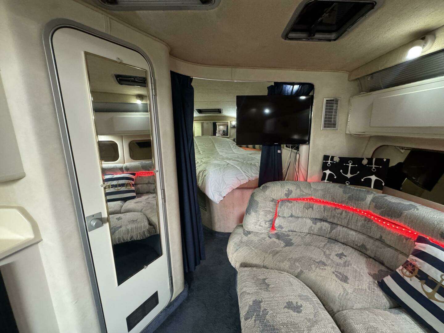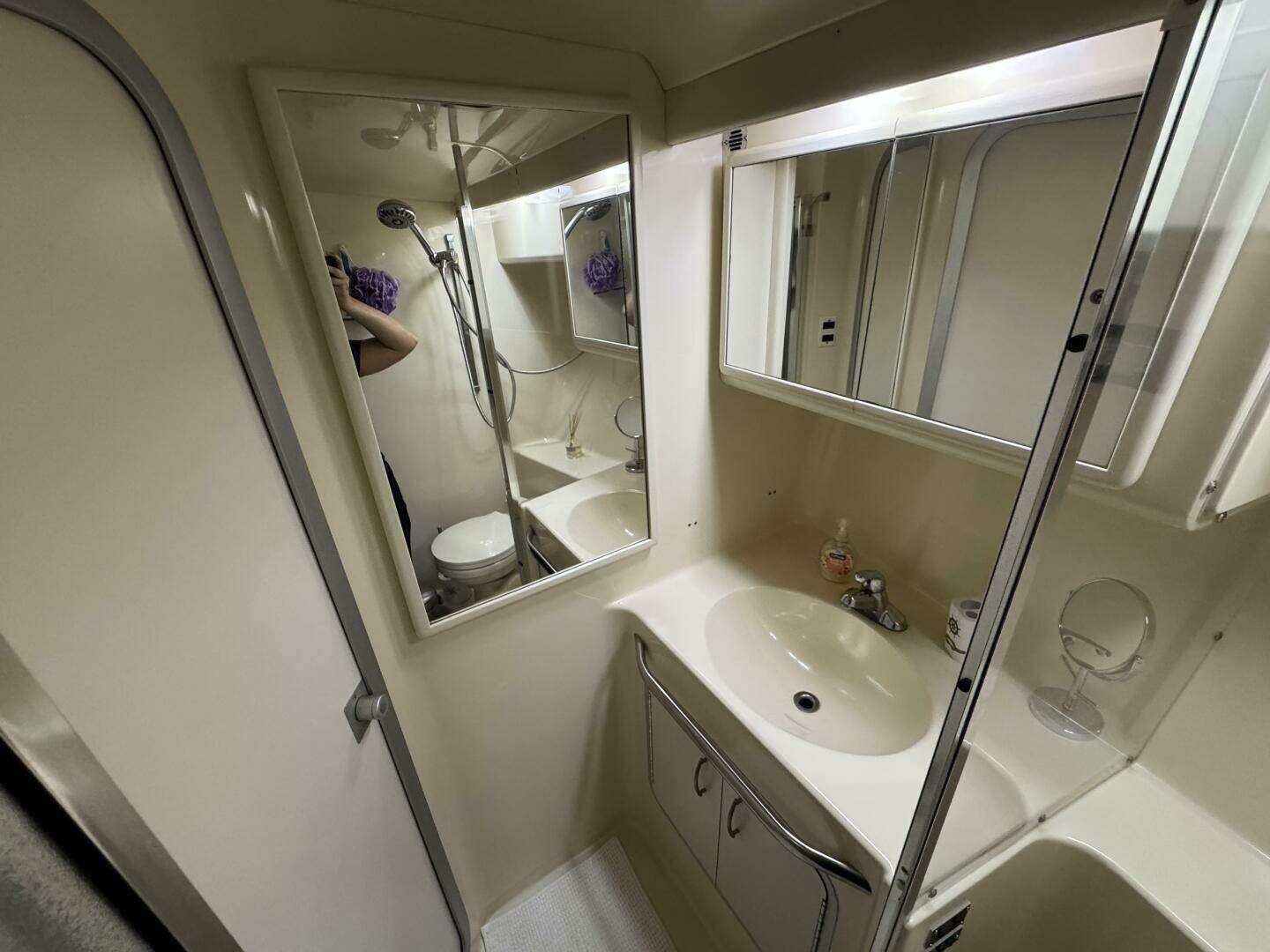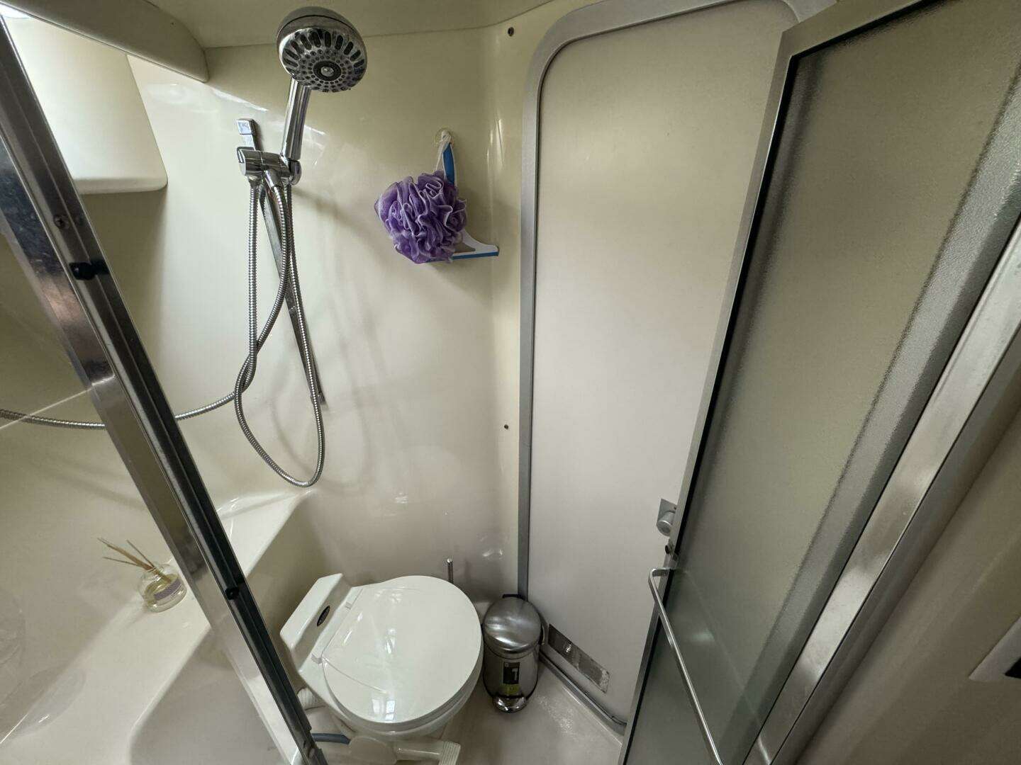 The interior is a bright and spacious salon with a oversized lounge that converts to a dinette, a flat-screen television mounted on a swivel for viewing from both the salon and single forward berth. The galley features a large Danby refrigerator, ice maker, Panasonic microwave, three-burner electric stove, sink, and generous cabinetry. The private head is accessible from both the salon and forward berth, offering a separate shower partition with VacuFlush head as well as a dedicated dry vanity area with sink and and large mirror. Message or call us to book a private viewing!