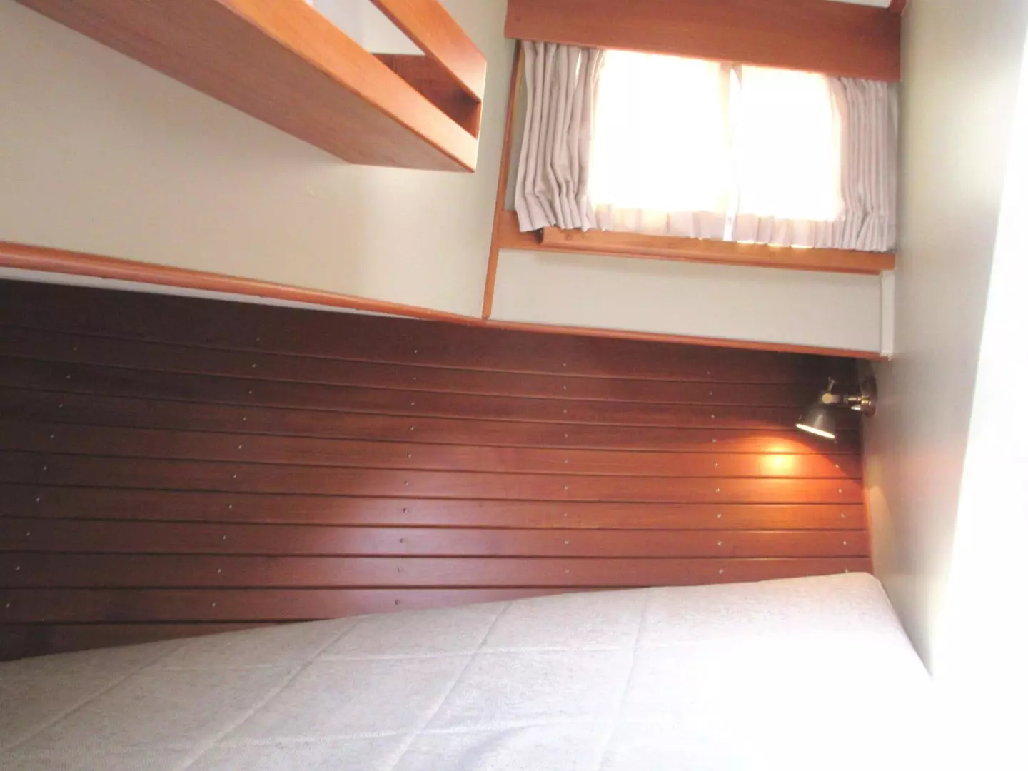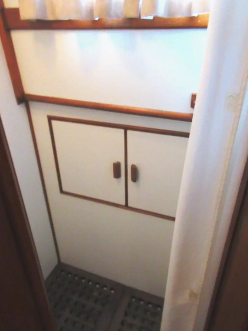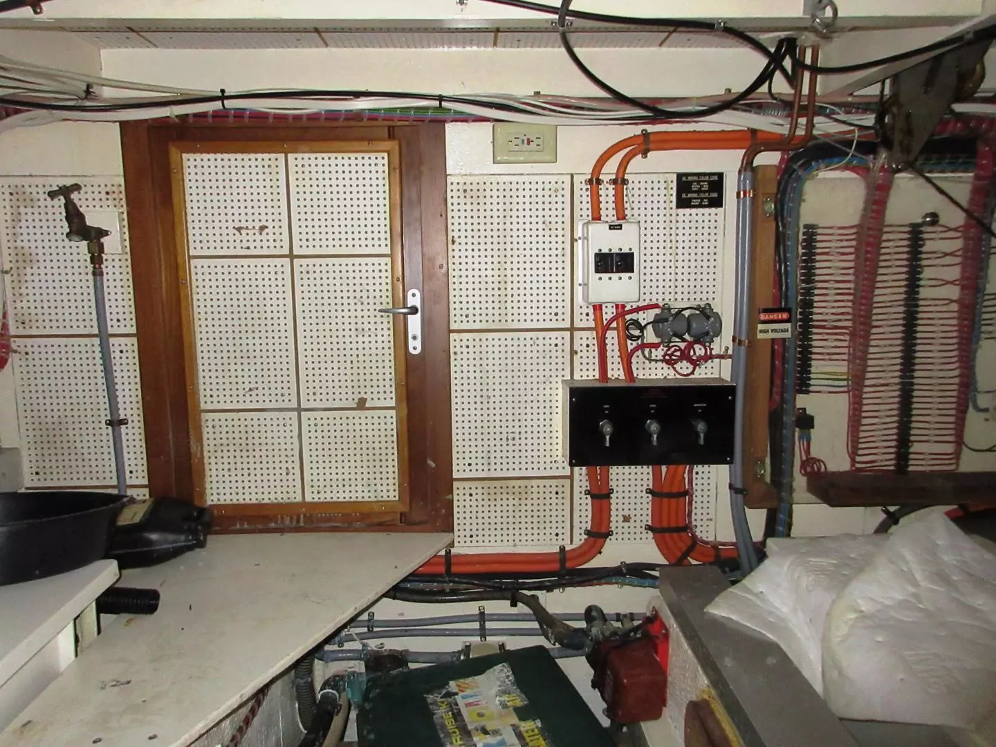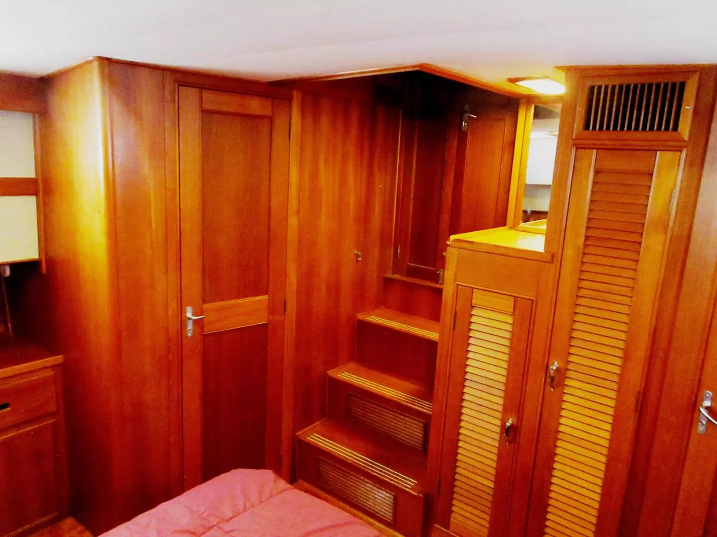 The Engine Room is accessible via a large hinged hatch in the Salon sole amidships as well as a entrance door located under the stairs (note: they lift up & can be latched) in the Fore / Guest Stateroom.