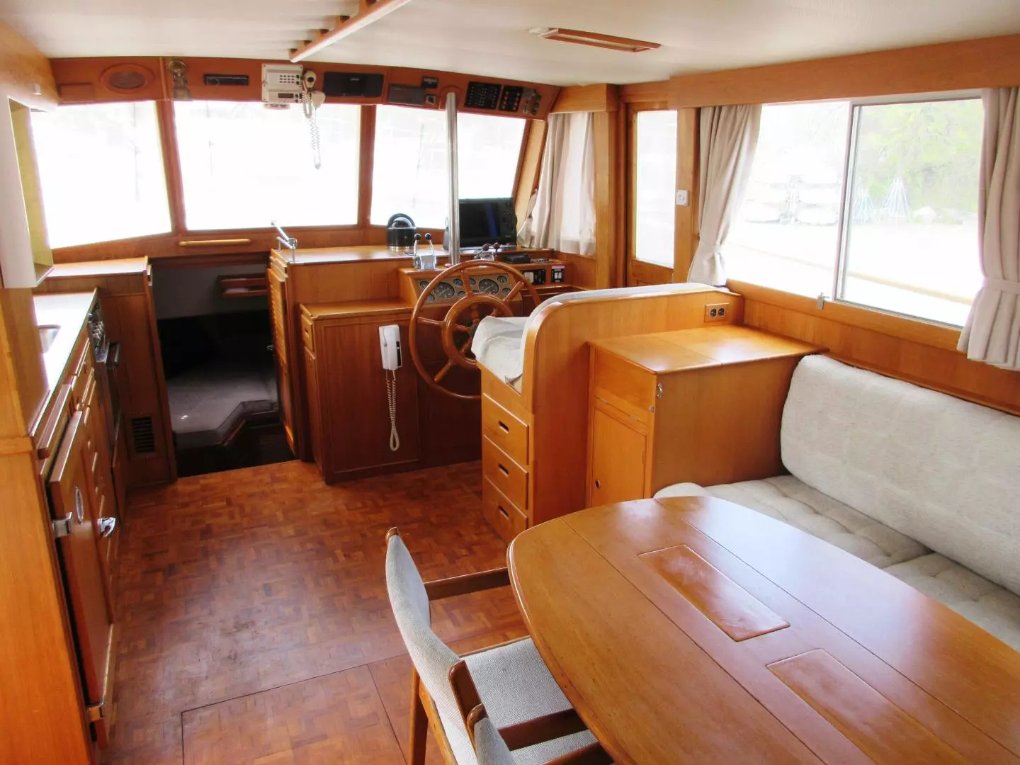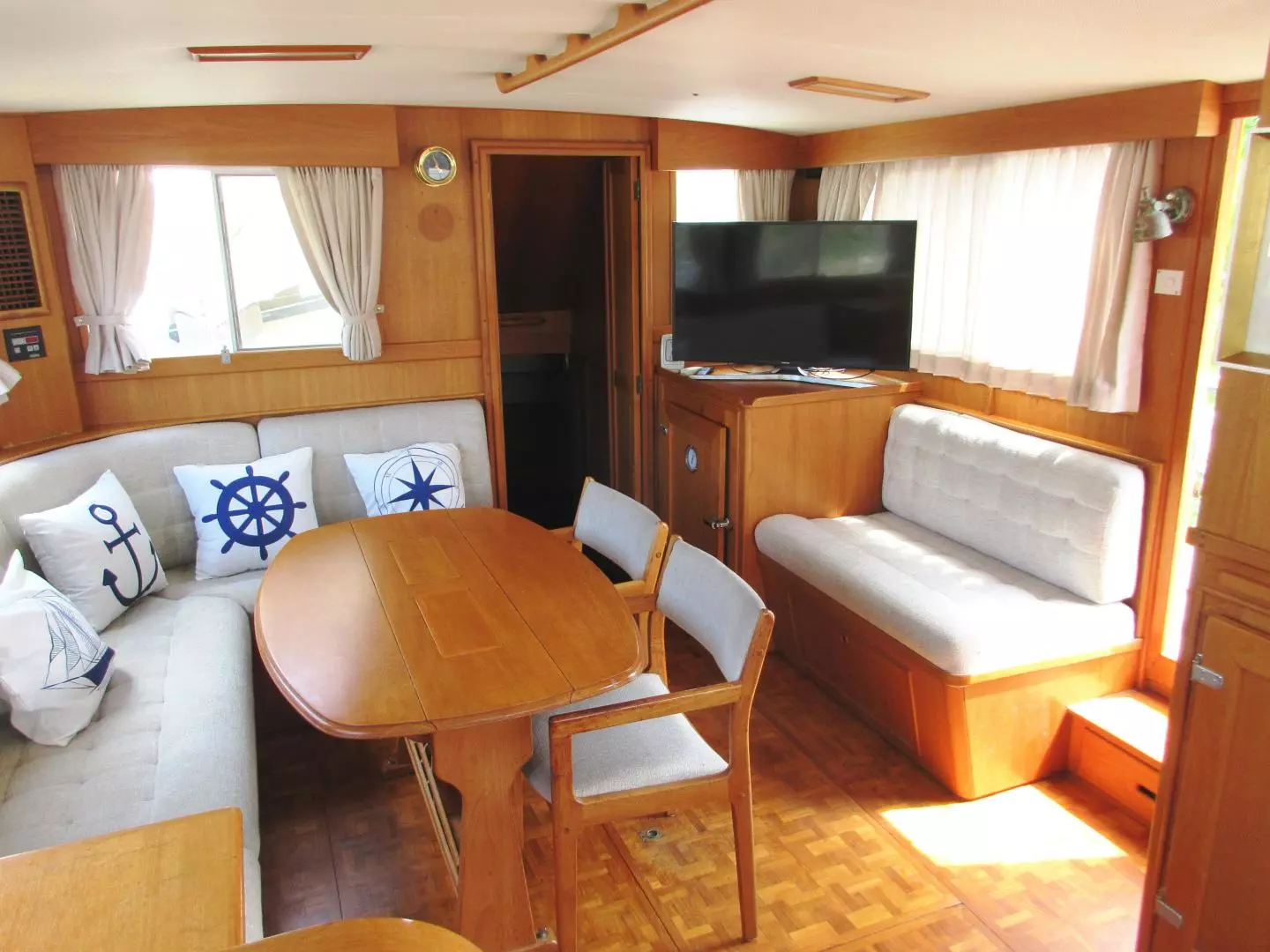 The Salon has the optional fixed Helm Station Seat along with the "oval" vis "square" table.