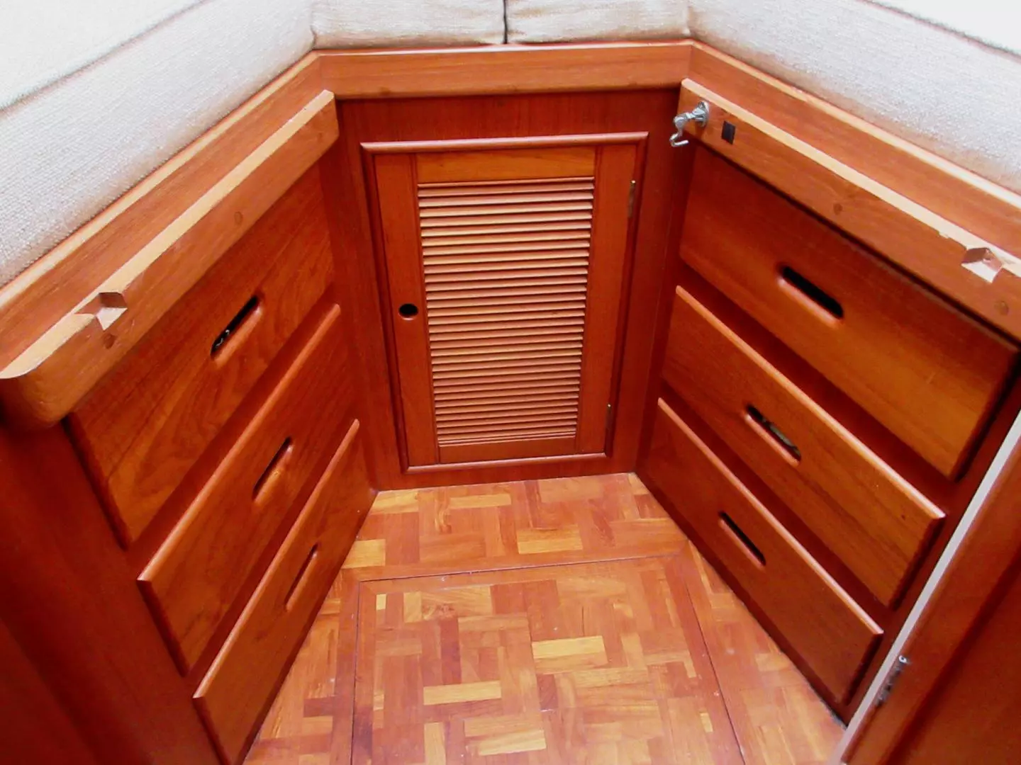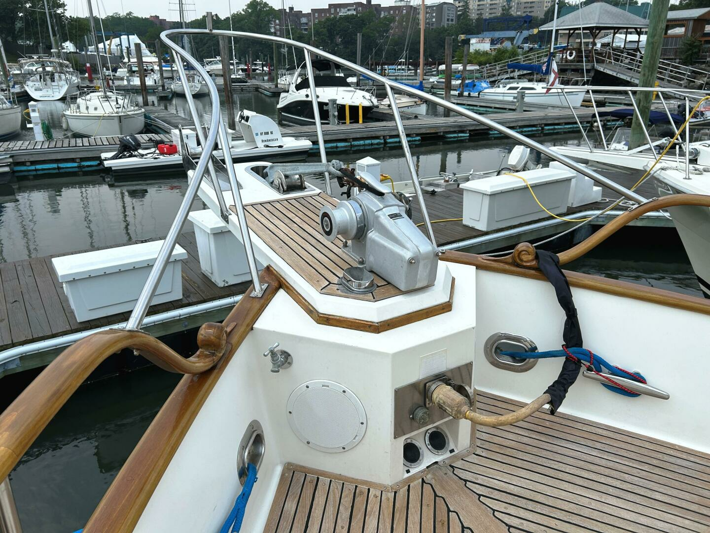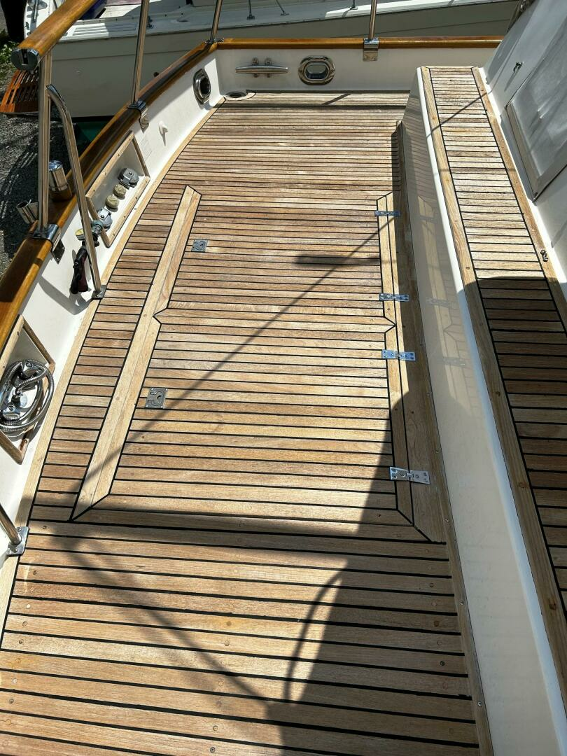 - Built-in GB deck box, forward of Cabin trunk, w/ teak top, teak interior grating & stainless steel brackets for fenders