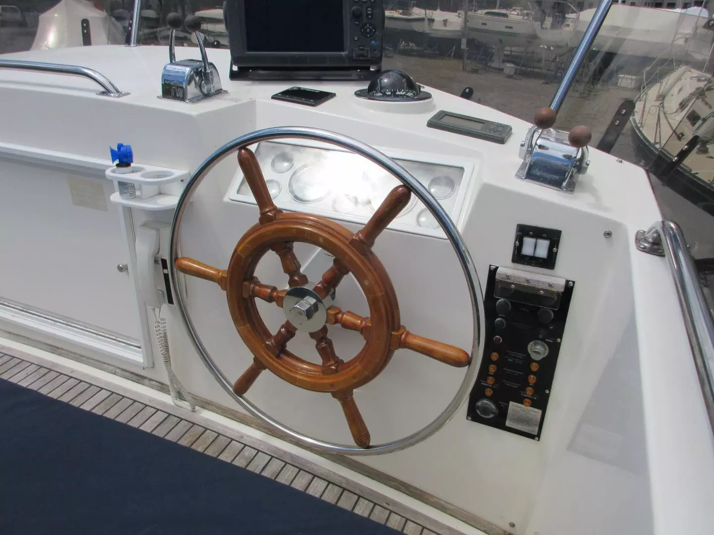 - Wheel steering, spoked teak w/ Destroyer-type stainless steel rim, 28" diameter