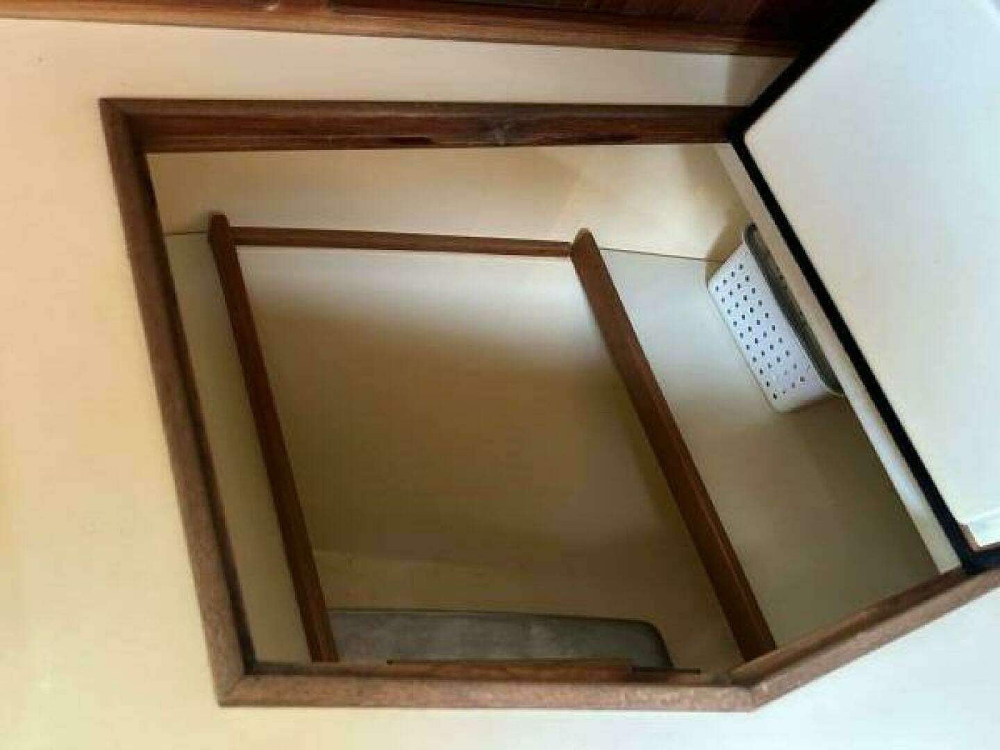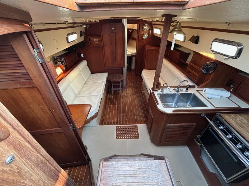 The main salon features comfortable port & starboard settees and a bulkhead-mounted table that drops down to accommodate dining. In the dropped position, the table reveals additional shelving for those favorite books, cards, or libations. When the table is stowed, the salon has a very spacious and uncluttered feel with the 12' beam and 6'4" headroom. There is terrific storage beneath both settees.