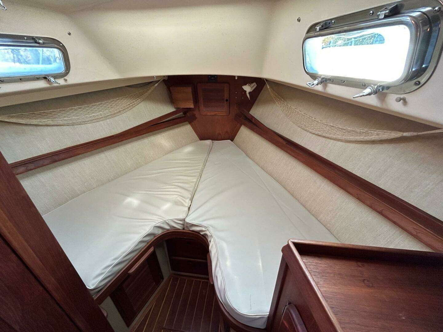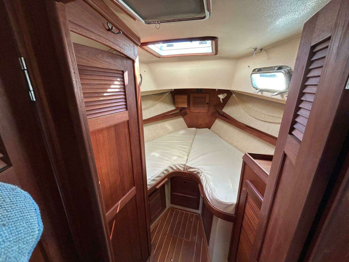 The forward stateroom offers a large, comfortable berth with storage drawers below. The forward cabin provides plenty of ventilation in the form of a large overhead hatch and two opening ports.