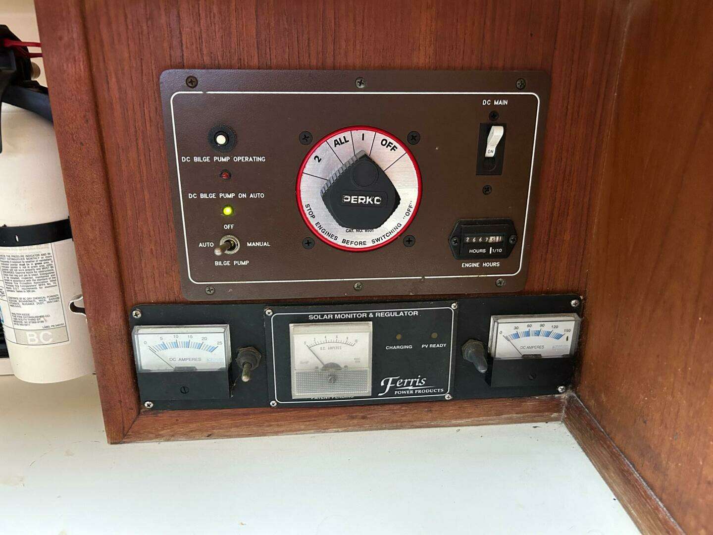 The navigation table shares the aft end of the port settee for the navigator’s seat and has ample room for bound chart kits or folded charts. The electrical control panel is housed in a built-in cabinet over the nav table, with the stereo and radio located in a panel to the right.