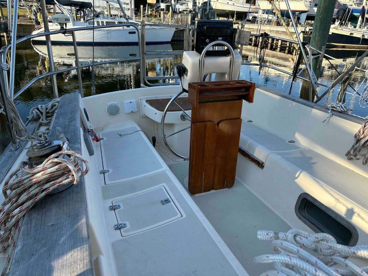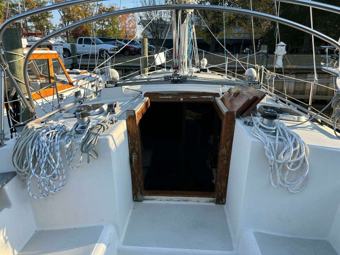 -Immediate anchor availability on the bow with roller fairleads for two anchors, a newer Maxwell windlass and stowage below for rode