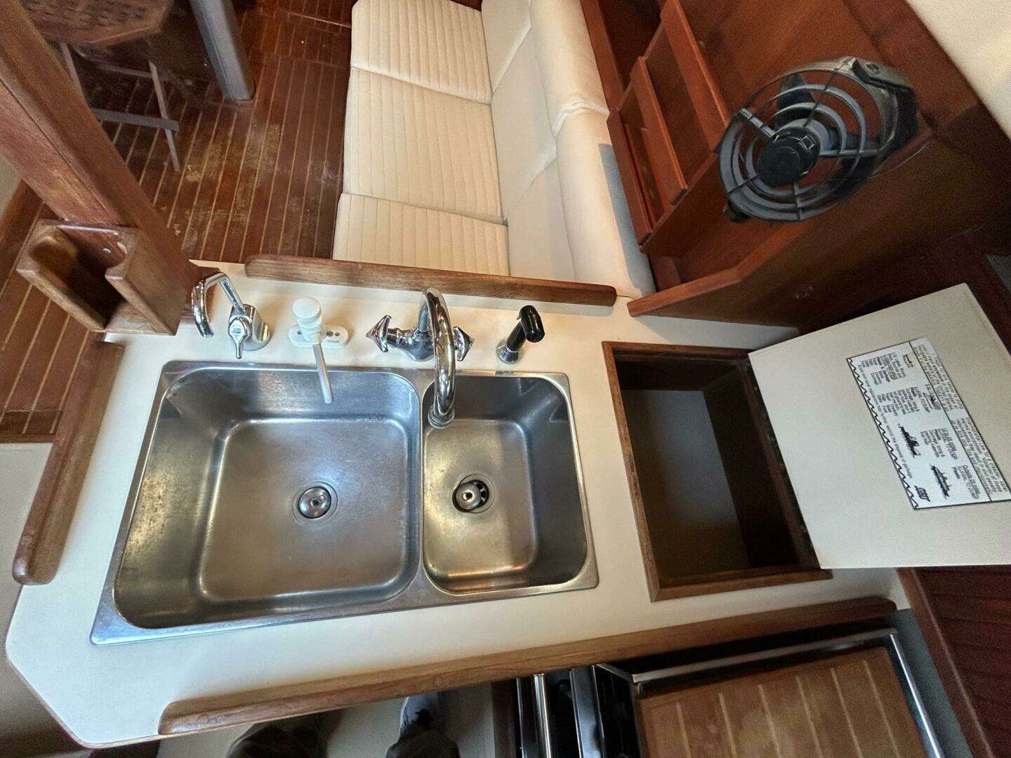 The Galley is starboard aft in a wrap around 'U' shape that gives a secure location for working in a seaway. It incorporates molded non-skid to increase safety and durability in this high-traffic area. The well-insulated ice-box/refrigeratro has interior shelves and ample volume for holding provisions. Numerous drawers, cabinets and lockers, and built-in dish and cutlery storage provide ample room for stores and utensils. In addition, the galley features a fold-up counter extension, two deep polished stainless steel sinks, a safety-type LPG range with oven complete with guardrail and harness attachments.