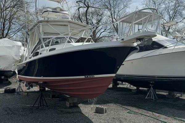 This classic Blackfin 29 Combi is a serious fishing machine combined with overnight accommodations. Equipped with the optional half tower, out riggers, rod holders, salt and fresh water washdowns and twin Caterpillar 350 hp diesel engines performance and economy are her hallmarks. The engines are set low and far apart in the deep-vee hull creating a stable fishing platform. The high-aspect rudders are externally hung making the boat very maneuverable. Blackfin’s craftsmanship and attention to detail are obvious. The hull is hand laid solid fiberglass with longitudinal stringers combine with a form cored deck making her able to stand the rigors of offshore fishing. All deck fitting have backing plates. Below deck the compact cabin includes a convertible dinette/V-berth, a mini-galley and an enclosed standup head with shower. Her sexy lines make her a real head turner. Unfortunately the owner’s failing health forces her sale.