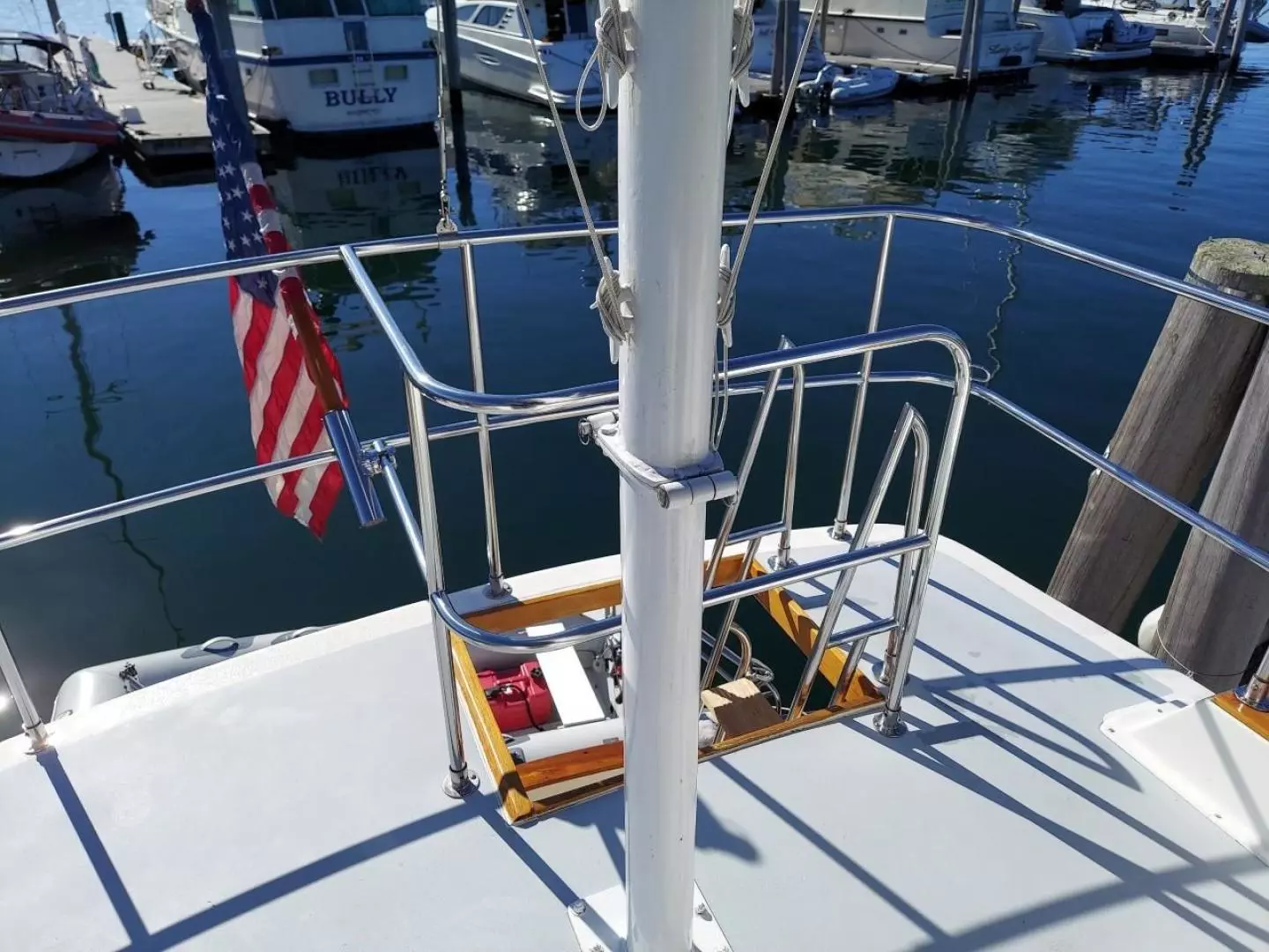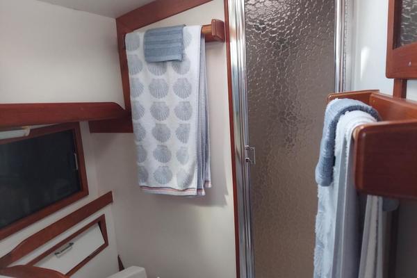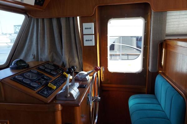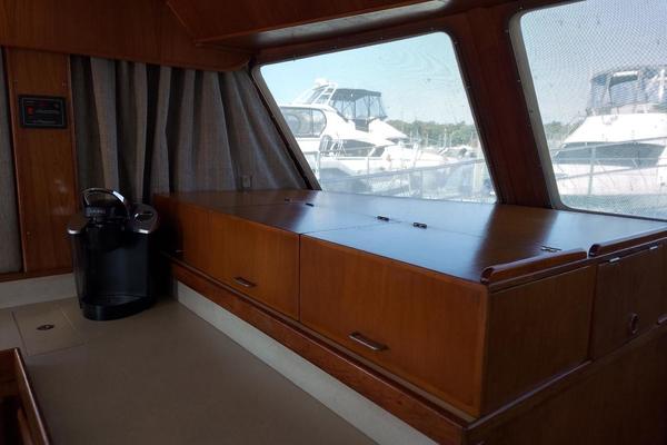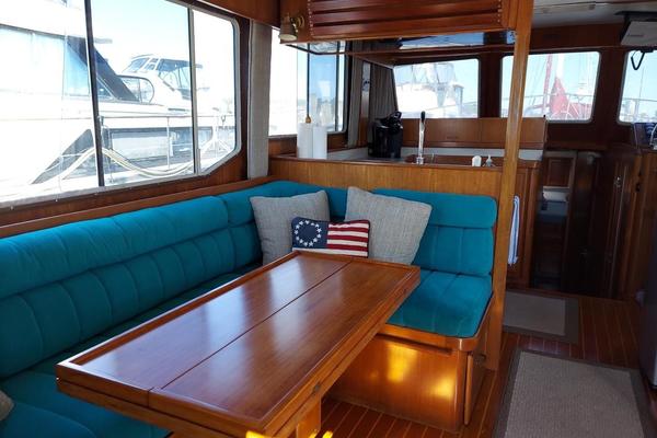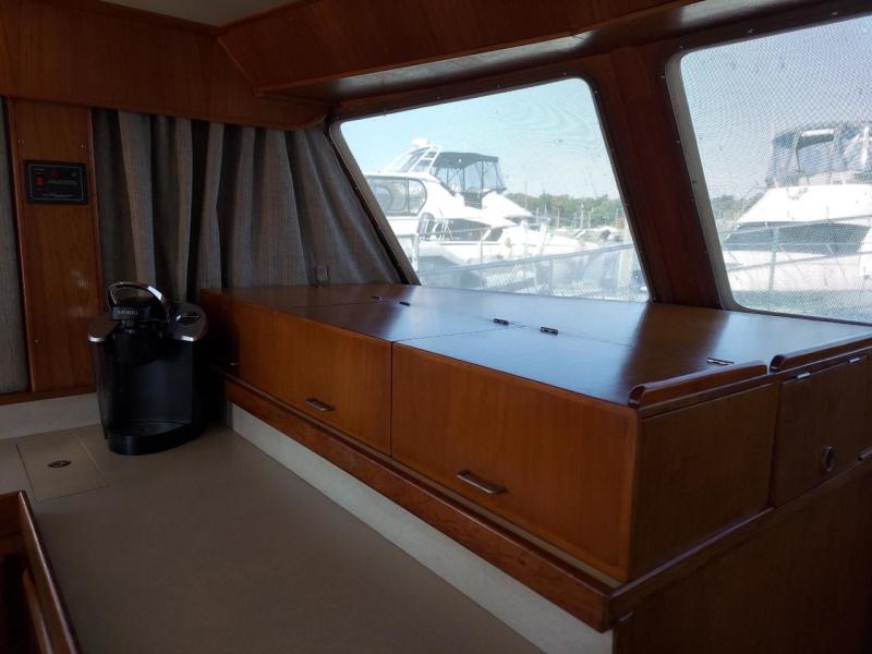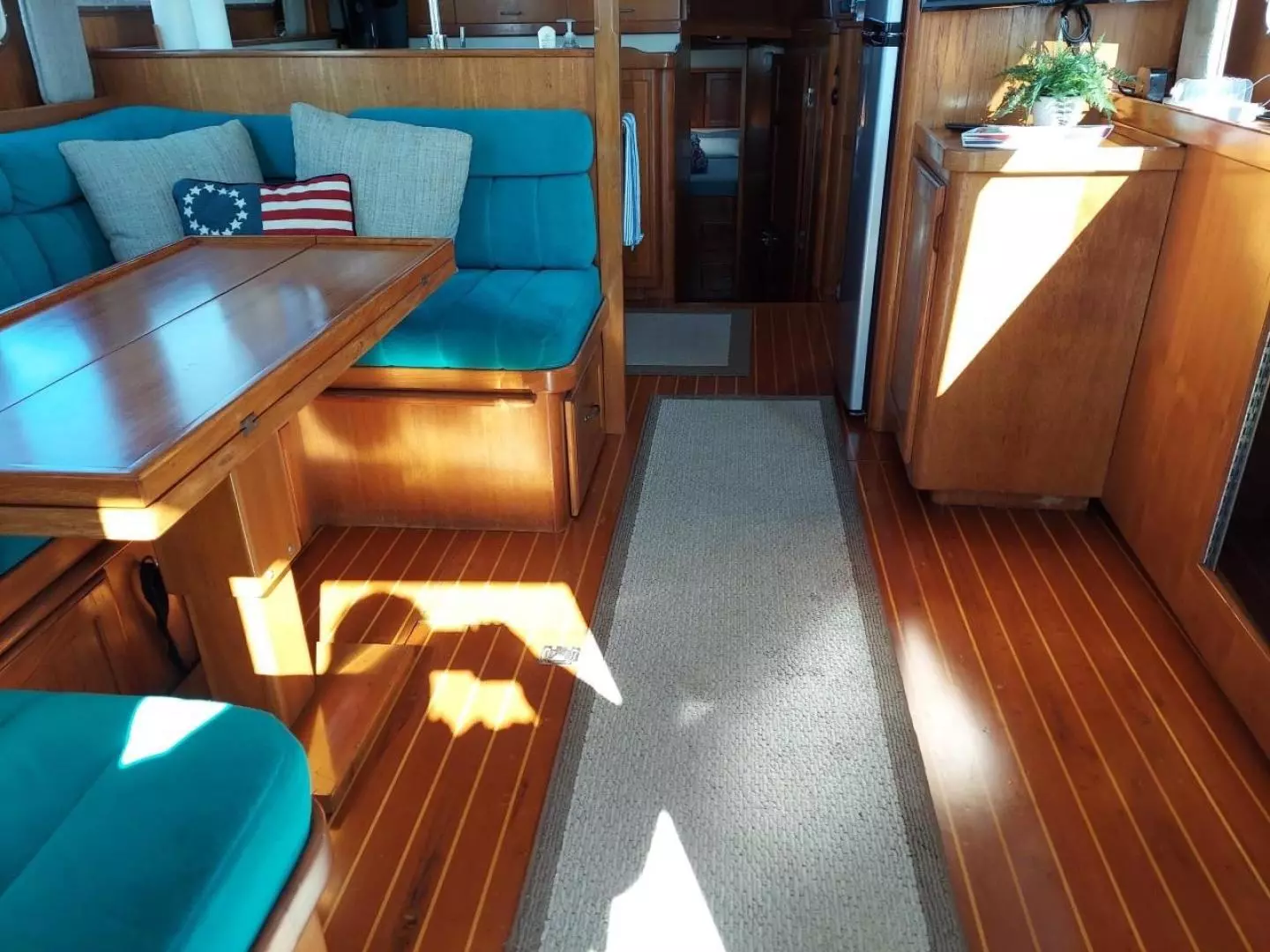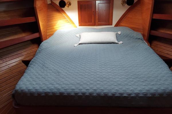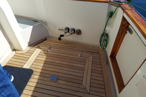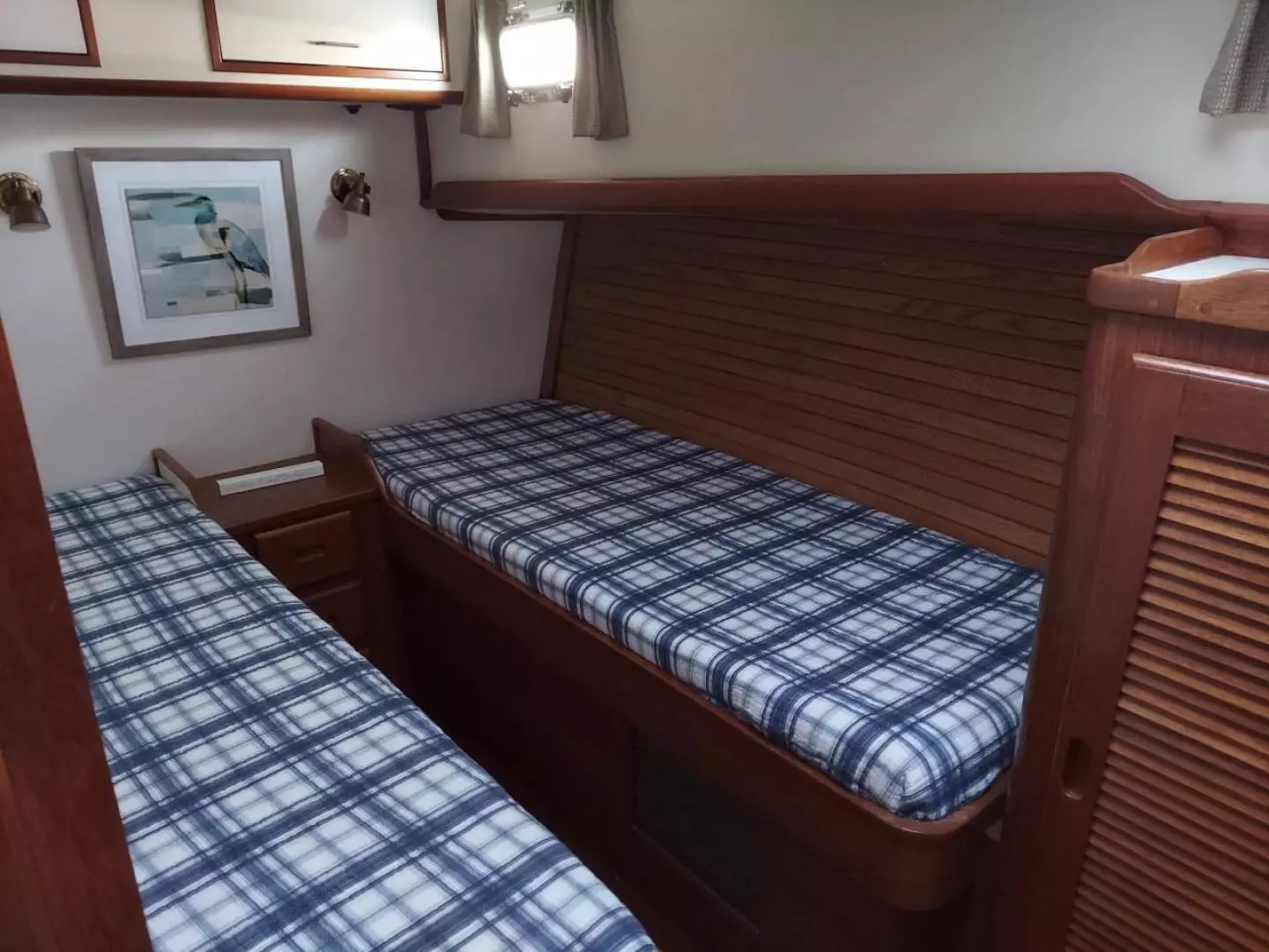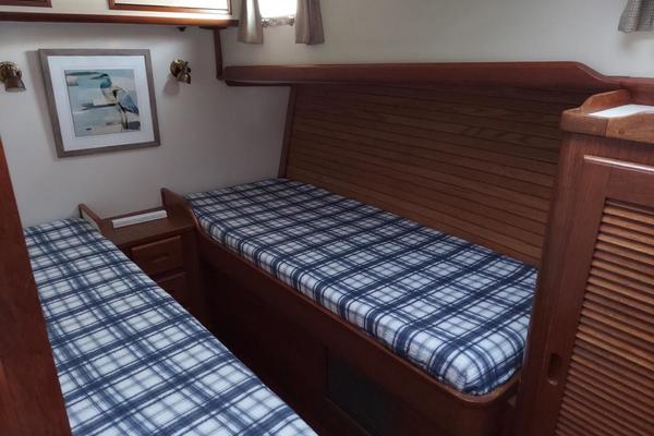 The Master stateroom is forward with a queen size island bed. Custom Shelving Port and Starboard. Aft to starboard is the master head with separate stall shower. Aft to port is the second stateroom with single beds sis by side. Aft again to starboard is the day head with sink, vanity and mirror. Up a couple of steps to the main salon with the lower helm to starboard and the spacious galley to port. Aft to port is a large U-shaped dinette area with a high low teak table. Beautiful brightwork throughout is in keeping with the classic Cape Dory style and quality. Up on the flybridge you have a center helm with 2 helm seats and an L-shaped settee behind.