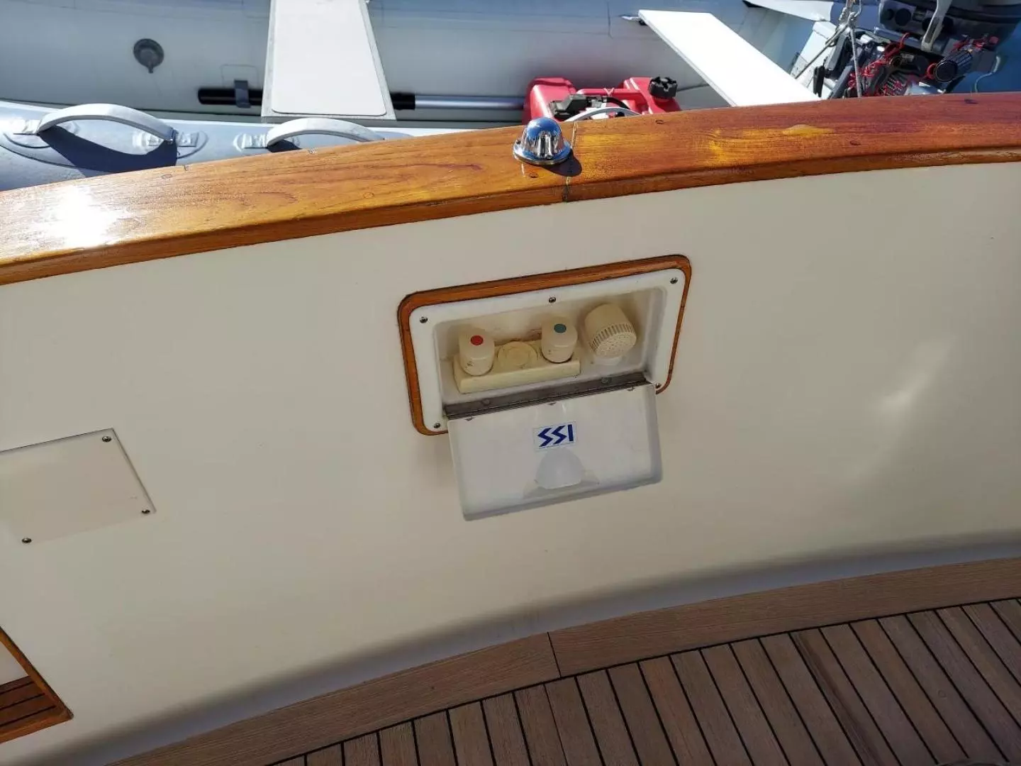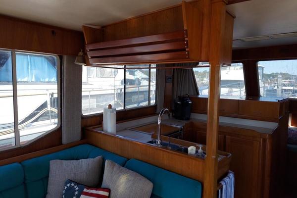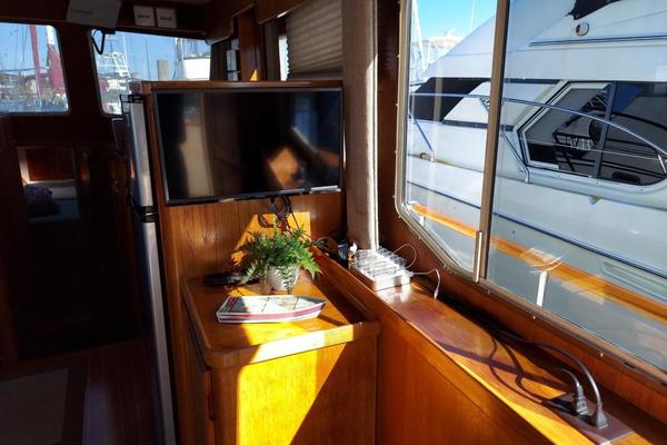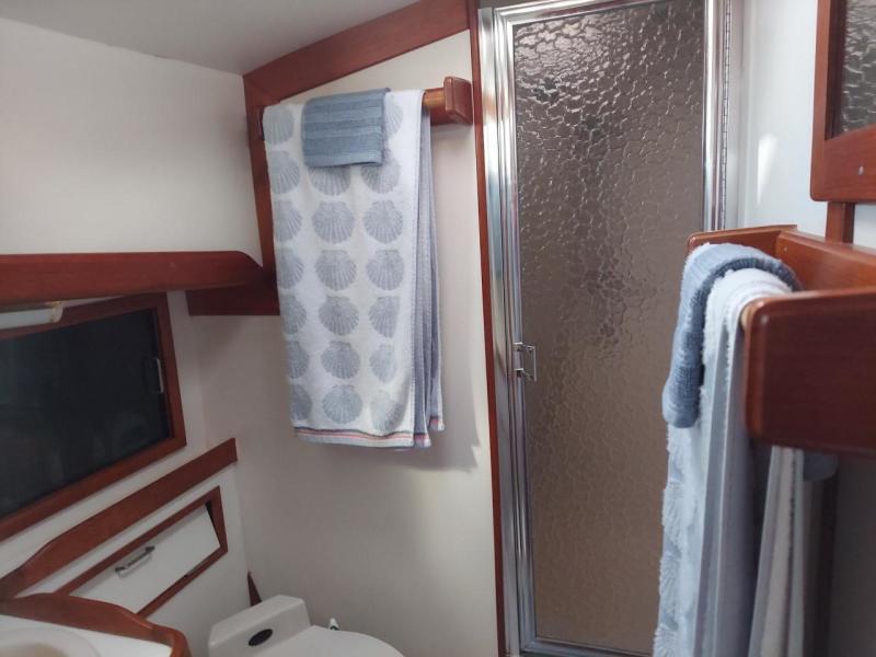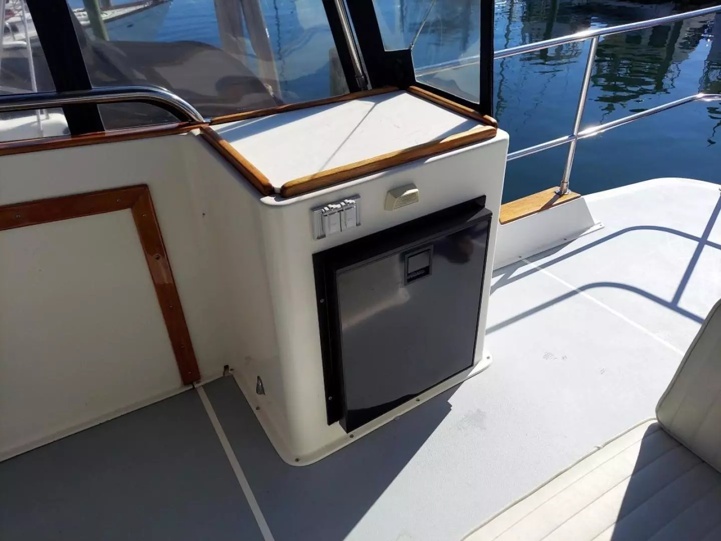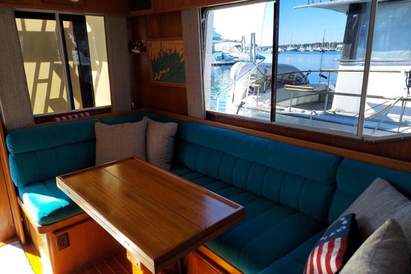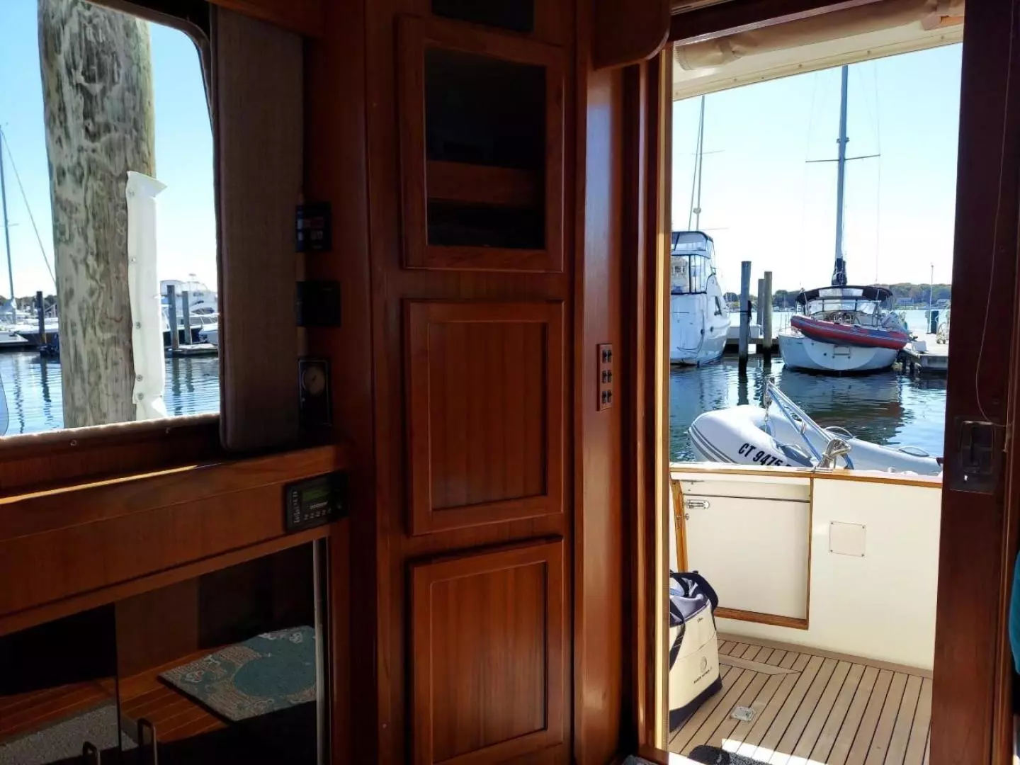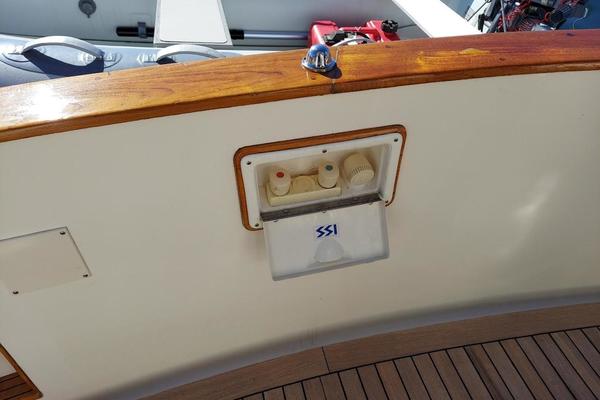 The Master stateroom is forward with a queen size island bed. Custom Shelving Port and Starboard. Aft to starboard is the master head with separate stall shower. Aft to port is the second stateroom with single beds sis by side. Aft again to starboard is the day head with sink, vanity and mirror. Up a couple of steps to the main salon with the lower helm to starboard and the spacious galley to port. Aft to port is a large U-shaped dinette area with a high low teak table. Beautiful brightwork throughout is in keeping with the classic Cape Dory style and quality. Up on the flybridge you have a center helm with 2 helm seats and an L-shaped settee behind.