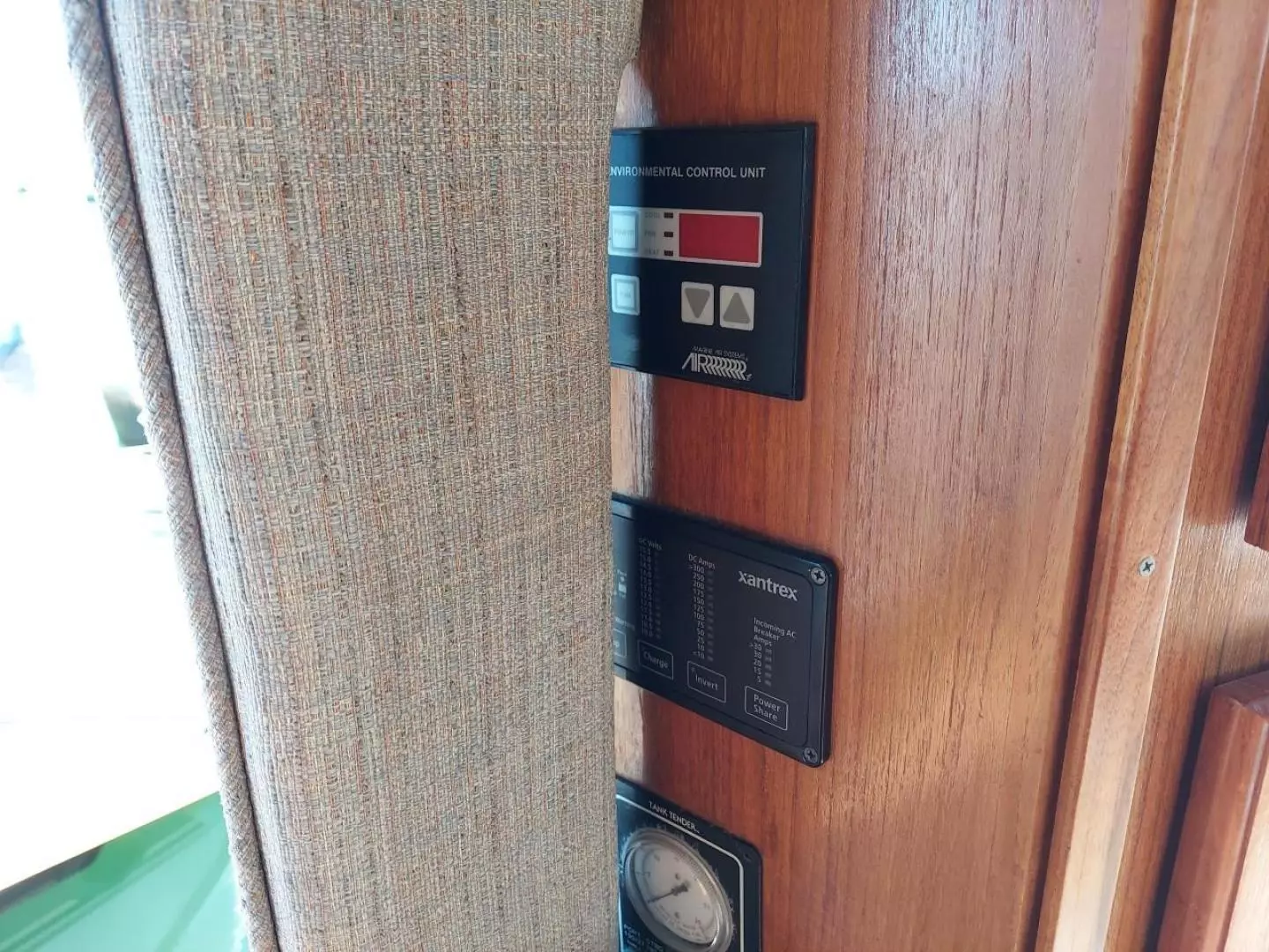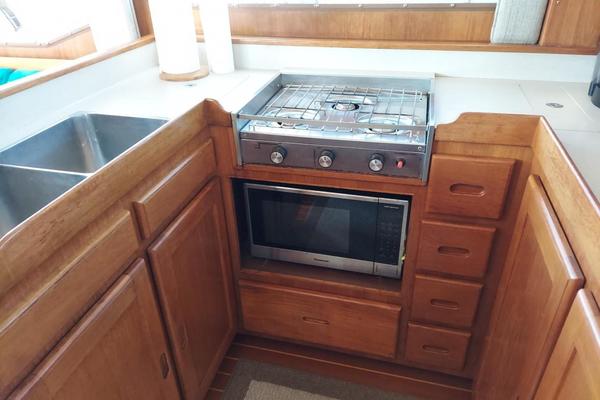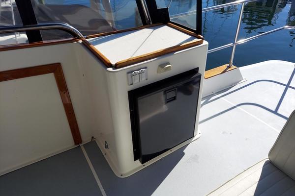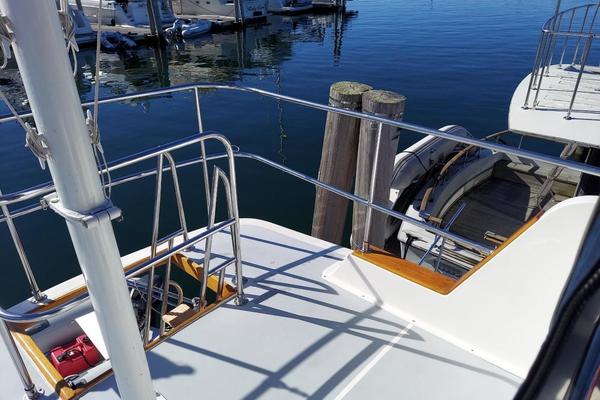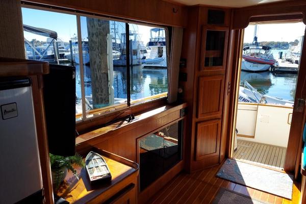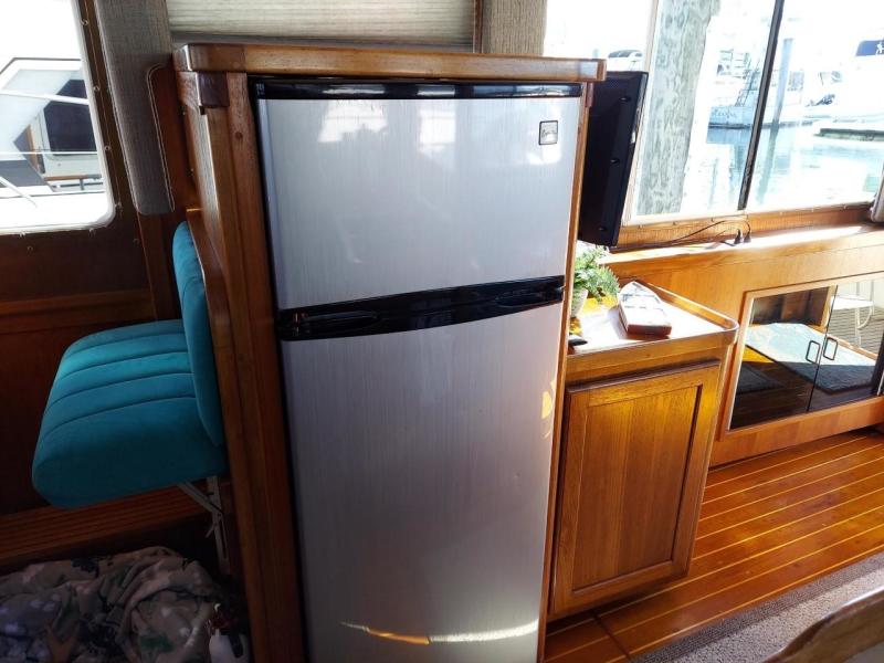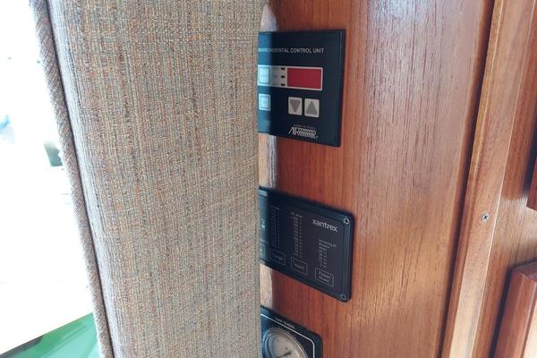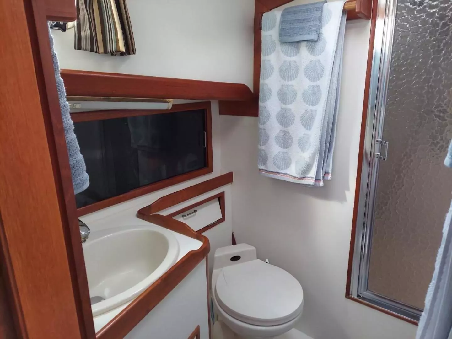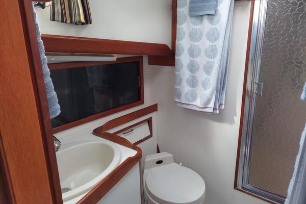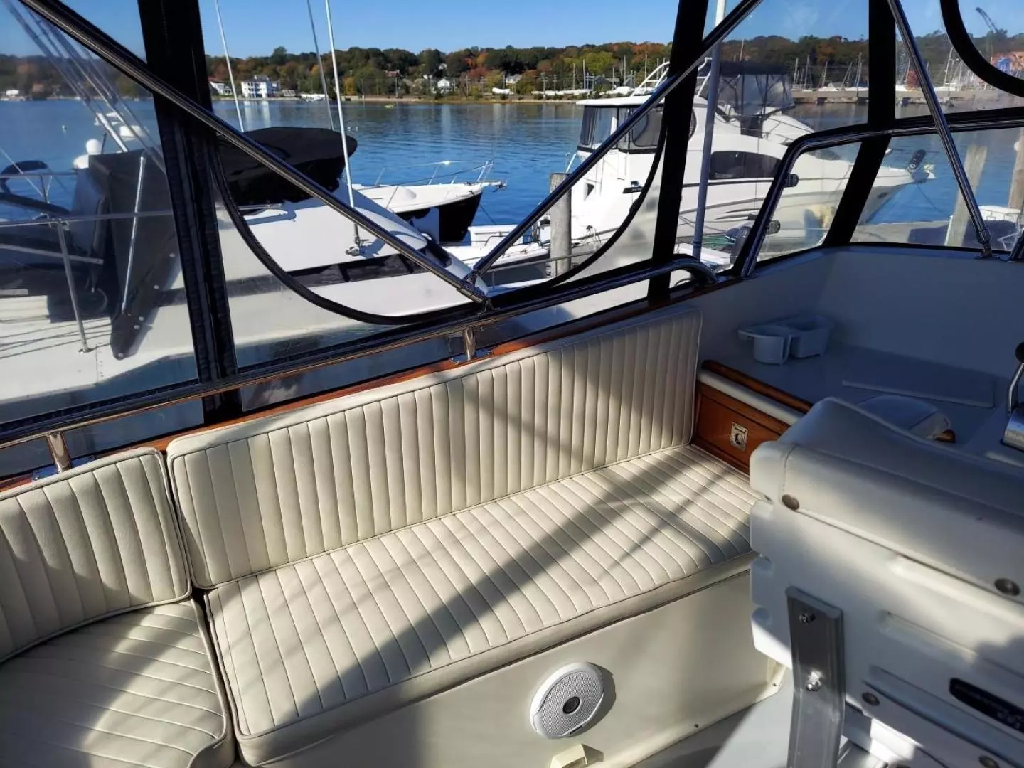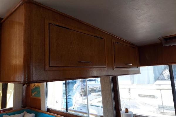 The Master stateroom is forward with a queen size island bed. Custom Shelving Port and Starboard. Aft to starboard is the master head with separate stall shower. Aft to port is the second stateroom with single beds sis by side. Aft again to starboard is the day head with sink, vanity and mirror. Up a couple of steps to the main salon with the lower helm to starboard and the spacious galley to port. Aft to port is a large U-shaped dinette area with a high low teak table. Beautiful brightwork throughout is in keeping with the classic Cape Dory style and quality. Up on the flybridge you have a center helm with 2 helm seats and an L-shaped settee behind.