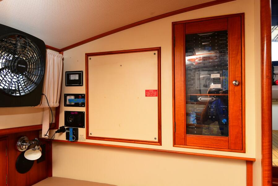 lockers, and beautiful woodworking throughtout. There is a filler for the berth. Details include Espar heat outlet, cable TV