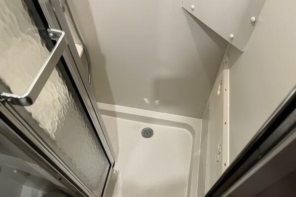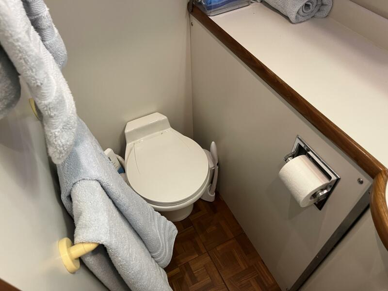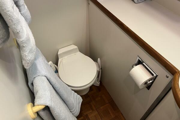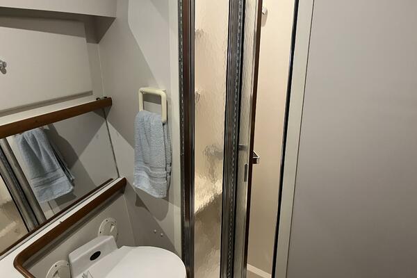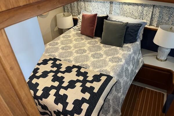 Aft of the salon, the master stateroom features a walk-around queen berth, a hanging locker, and a private en suite head. The forward guest stateroom provides an angled double berth, a hanging locker, and private access to the second day head.