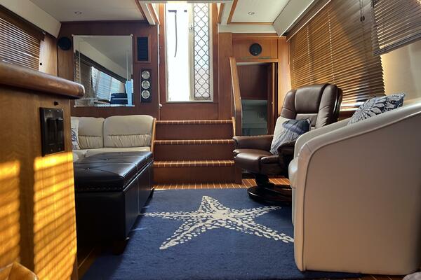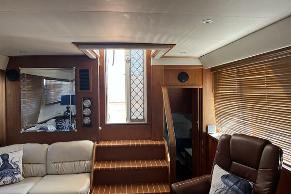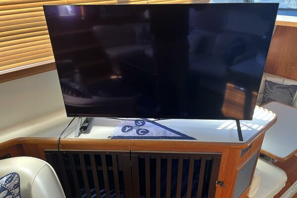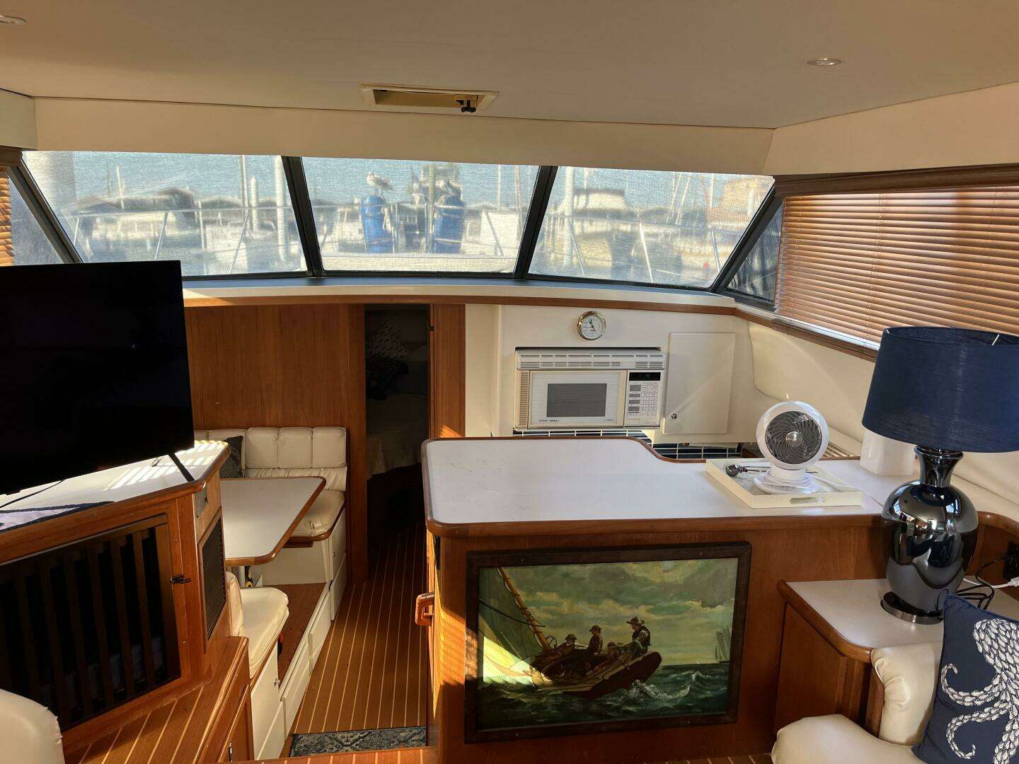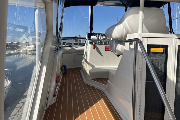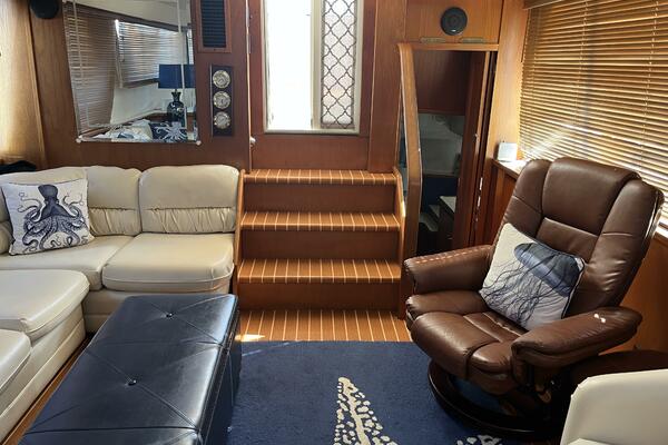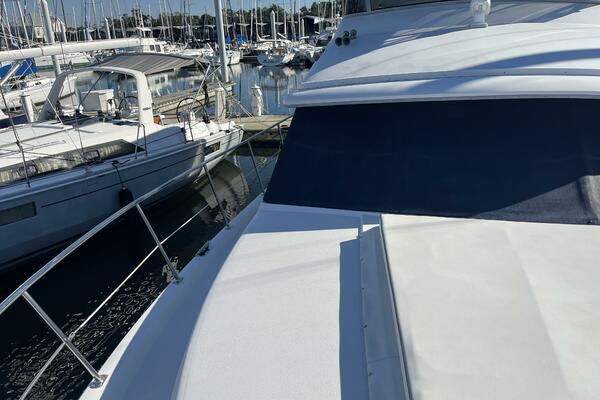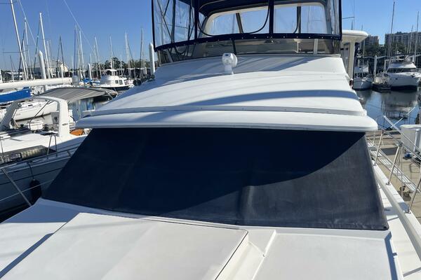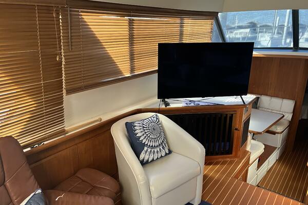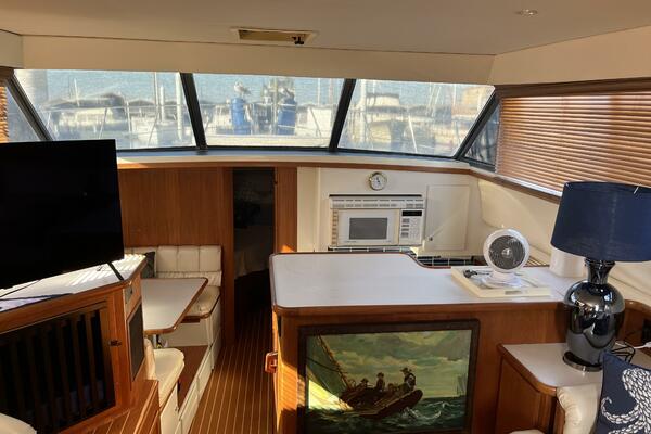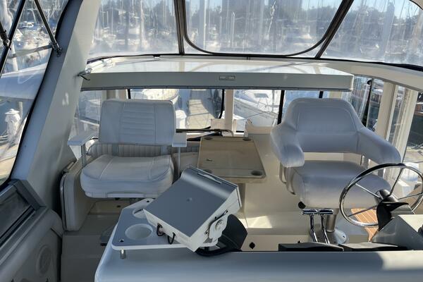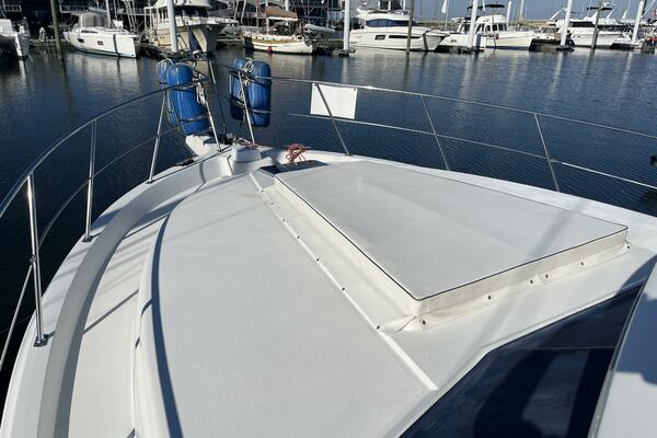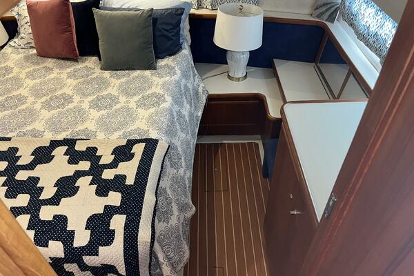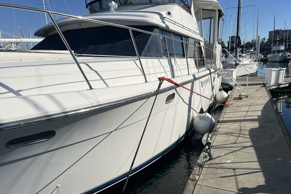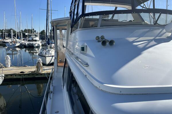 The 440’s semi-enclosed aft deck is appointed with a full wet bar, refrigerator, and ice maker. Standard amenities included a salon entertainment center, a foredeck sun lounge, aft deck wing doors, and a radar arch. Powered by Cummins 420hp diesels, the Carver 440 Aft Cabin cruises at 18–20 knots. The Carver 445 is an identical model, distinguished by an integrated swim platform.