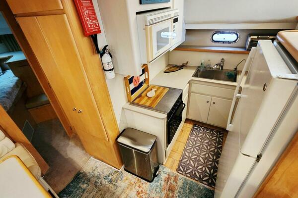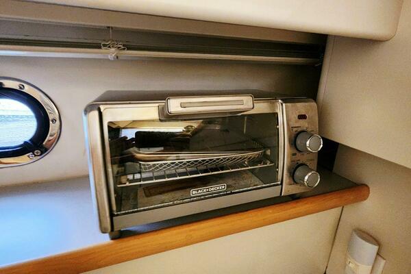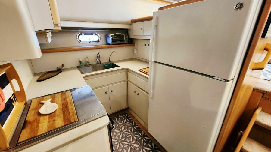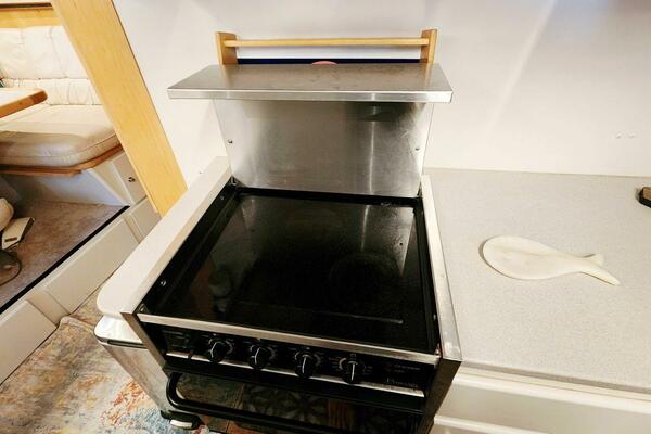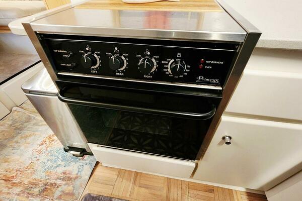 At the heart of it all is a full-sized residential refrigerator — no half-size compromises here. You can provision for weeks of cruising without juggling groceries or running out of space. Just beside it, a Princess oven with a three-burner ceramic cooktop gives you the tools to cook real meals aboard, from a quick breakfast to a full dinner spread.