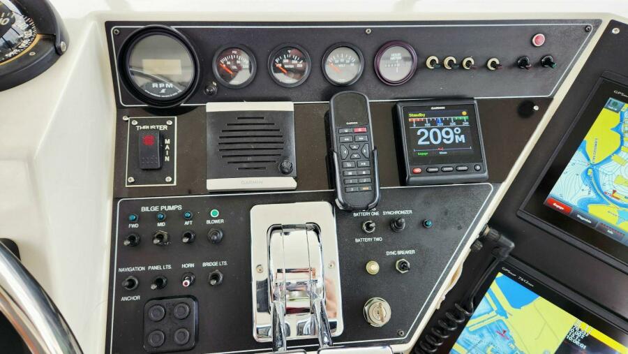 At the helm, you’ll find a pair of Garmin 7612 touchscreen chartplotters with sonar, delivering crystal-clear navigation and bottom imaging. Everything is tied into a NMEA 2000 backbone for seamless integration. A Garmin Reactor 40 Autopilot with dedicated display and wireless remote takes the strain out of long passages, while a backup camera adds confidence in tight marinas.