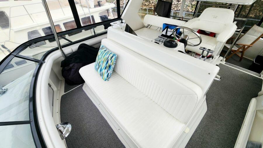 Heading up, the flybridge is nothing short of a showpiece. Here you’ll find a commanding helm equipped with Garmin 7612 chart plotters with sonar, send-and-receive AIS, and all the controls needed for confident navigation. But what truly elevates this space is the custom hardtop—a rare and highly desirable feature that sets Now or Never apart. Unlike canvas enclosures that demand upkeep, this solid structure provides unmatched weather protection and a noticeable reduction in heat, transforming the flybridge into a cool, comfortable retreat no matter the season. With clear visibility, excellent airflow, and ample seating, it becomes one of the most enjoyable places aboard—whether you’re underway, anchored out, or just watching the sunset.