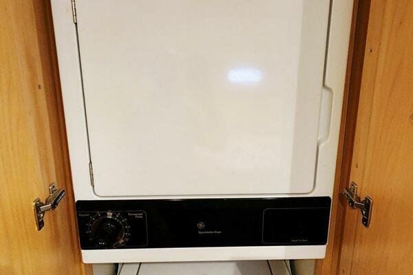 Plenty of counter space and abundant cabinetry provide storage for provisions and cookware, while the open sightlines keep the galley bright and connected to the salon and dinette. Across to port, the U-shaped dinette makes mealtimes social and comfortable, while just steps away, a full-sized stackable washer and dryer add true liveaboard convenience.