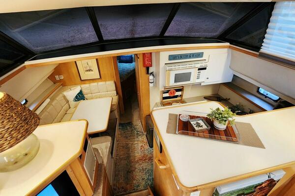 A couple of steps forward, the galley reveals itself as a chef’s delight. Outfitted with a full-sized residential refrigerator, Princess oven with 3-burner ceramic cooktop, and an upgraded large stainless steel sink with pull-out faucet, it has everything needed to prepare meals with ease. A thoughtfully added water filtration system ensures fresh, clean drinking water. Across to port, the U-shaped dinette provides a cozy spot to enjoy those meals, doubling as the perfect place to spread out charts or play a late-night board game.