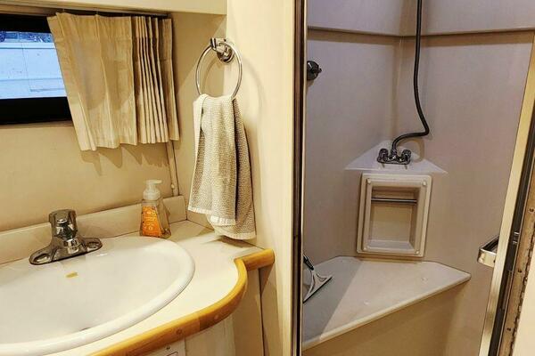 A full shower stall makes it practical for extended cruising, while the vanity and storage cabinetry provide space for daily essentials. Recent updates include fresh fixtures, serviced Vacuflush components, and improved plumbing, ensuring reliability and ease of use.