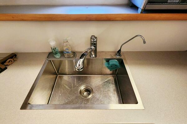 The galley has also been upgraded with a large single-basin stainless steel sink and modern pull-out faucet for easy prep and cleanup. And with the Bio-Logic UV drinking water purification system, every glass you pour and every batch of ice is fresh, clean, and reliable — a huge benefit when you’re spending weeks or months on the Loop.