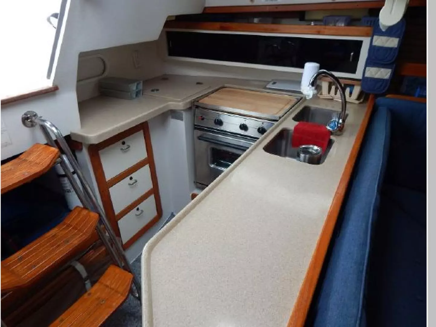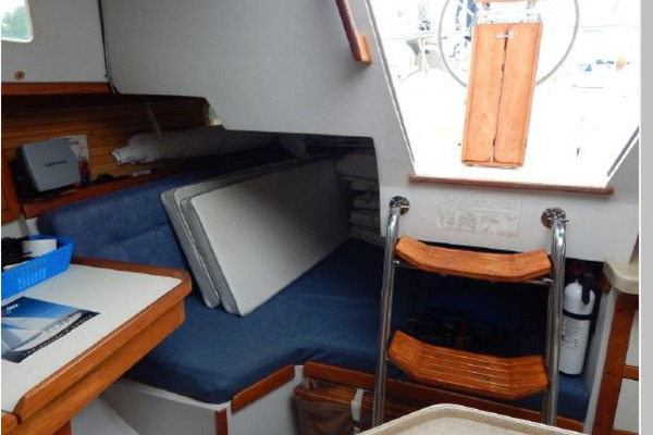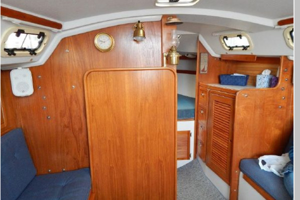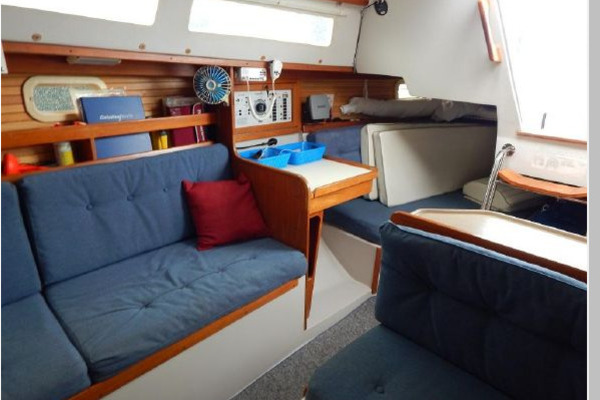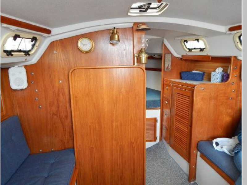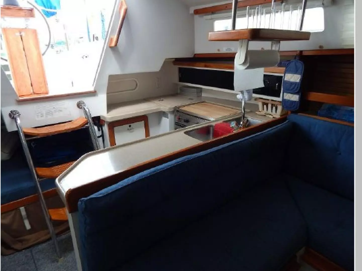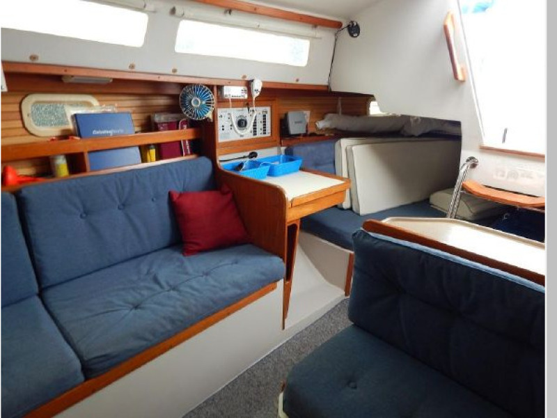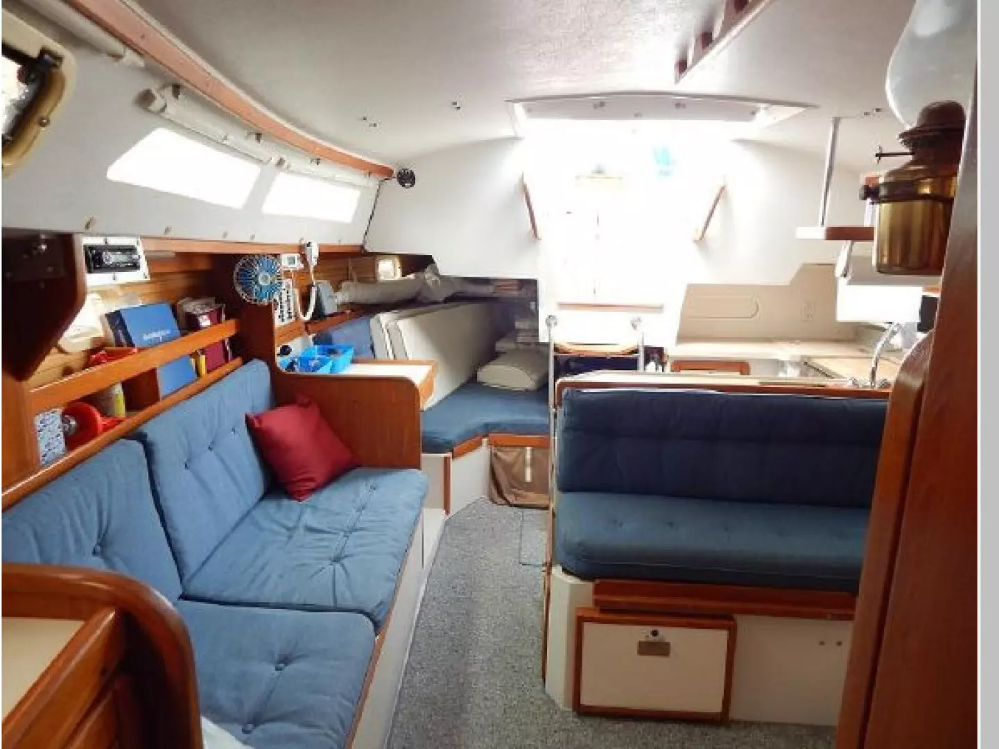 The interior joinery is light finished teak with ash ceiling, the sole is carpeted and the interior cushions are blue.