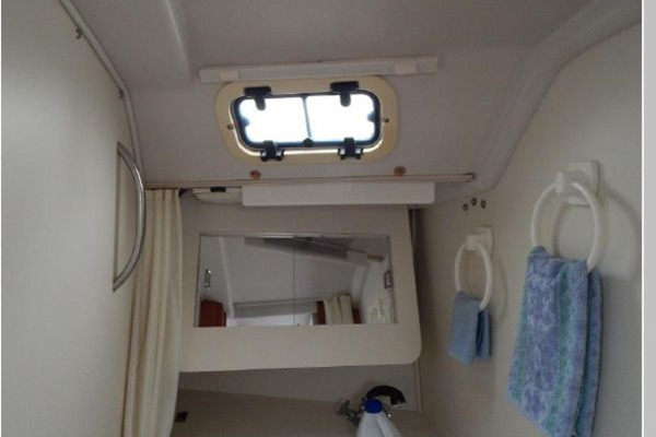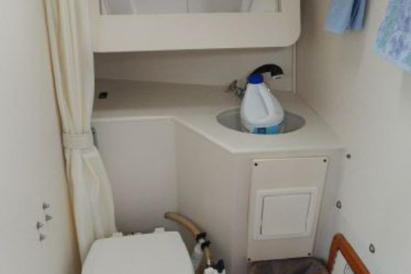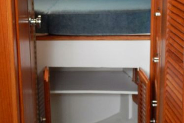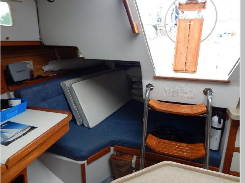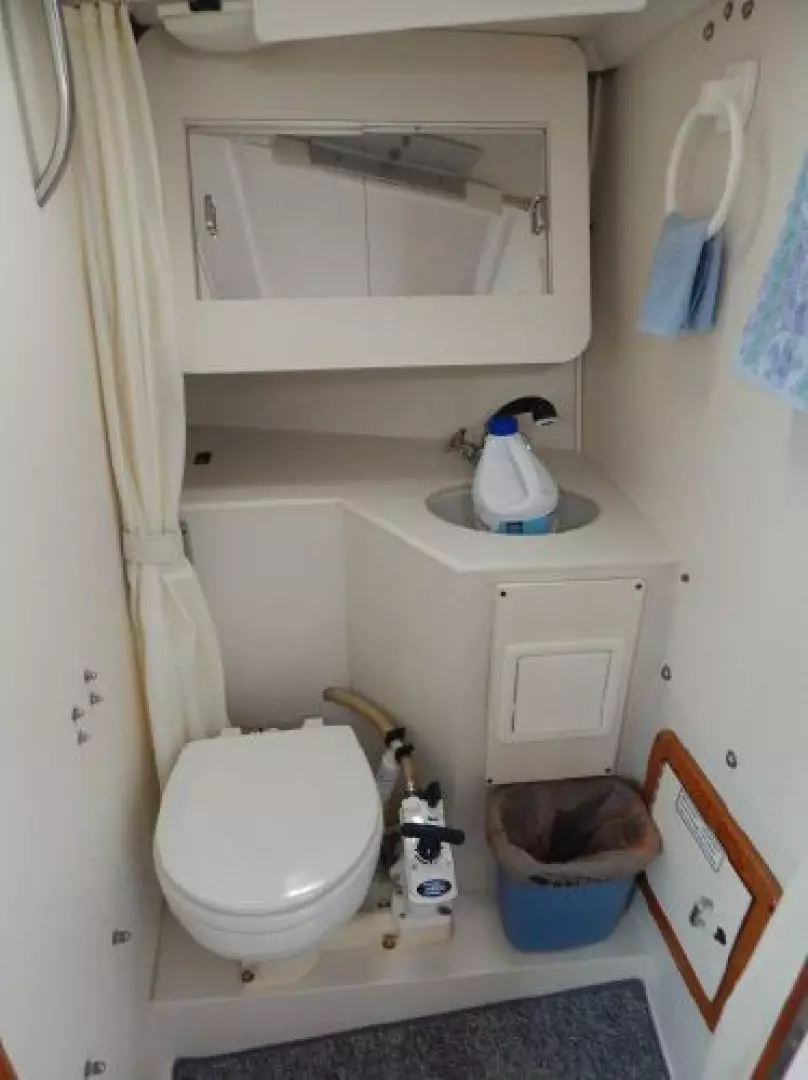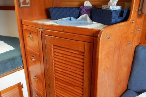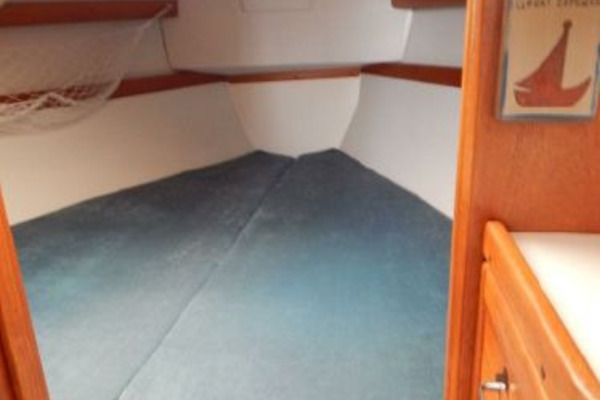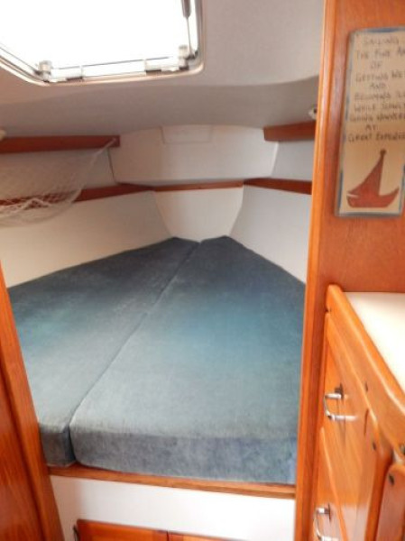 Furthest forward is the V-berth with new cushions, filler and storage below, next aft to port is the enclosed head and storage drawers and hanging locker to starboard.