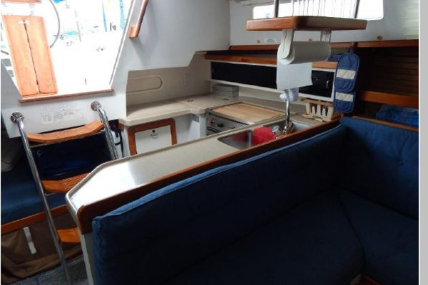 Next aft is the salon, to port is an L-shaped convertible dinette and a settee is to starboard. The galley is aft to port and the navigation station with quarter berth is to starboard.