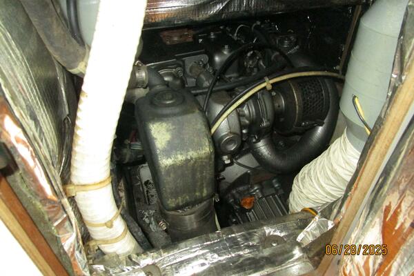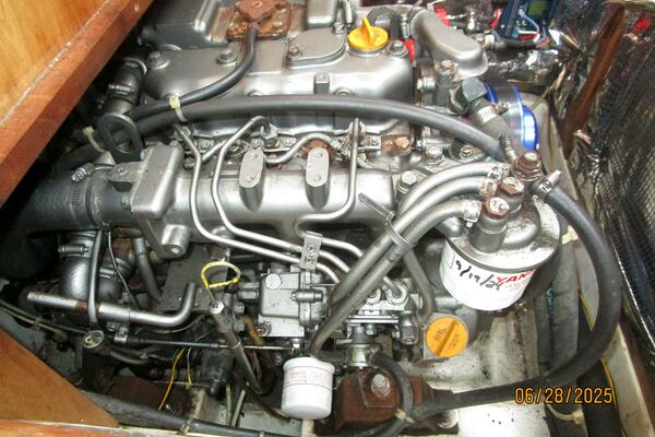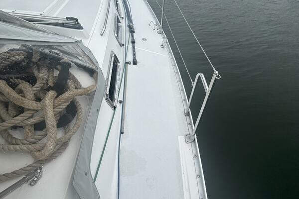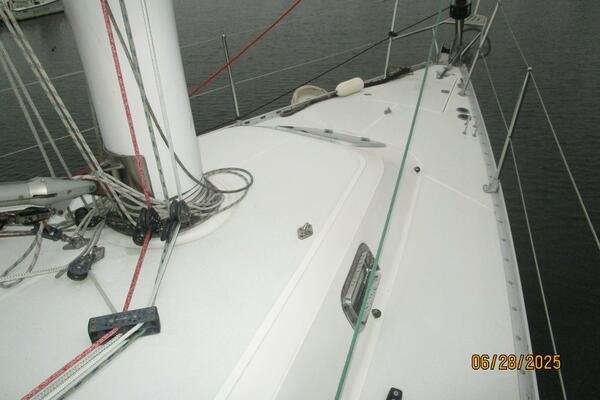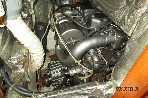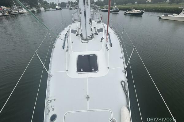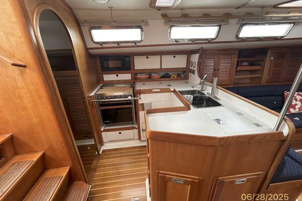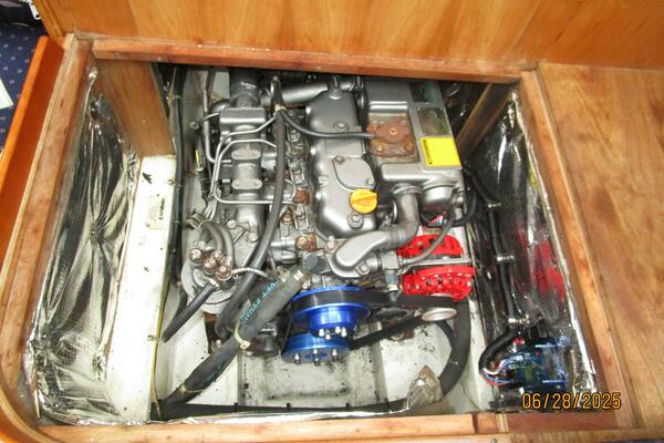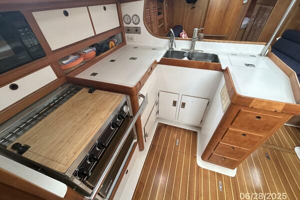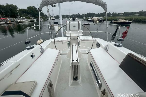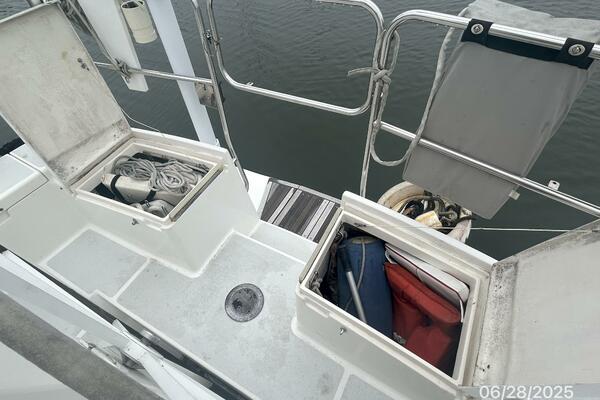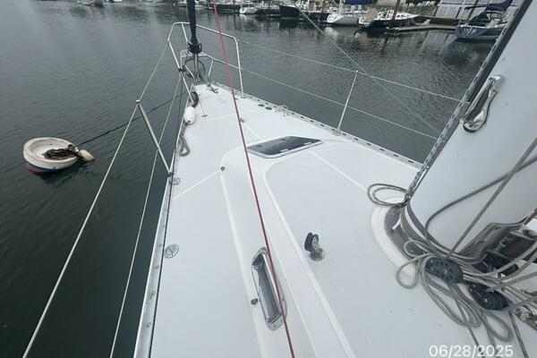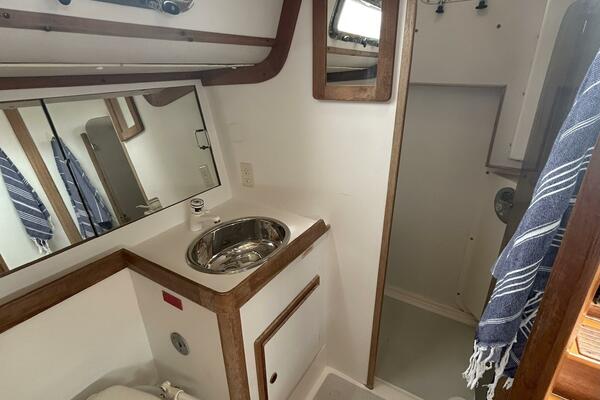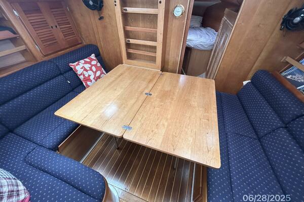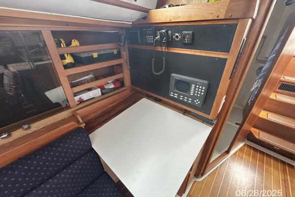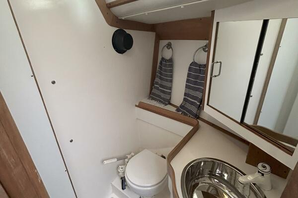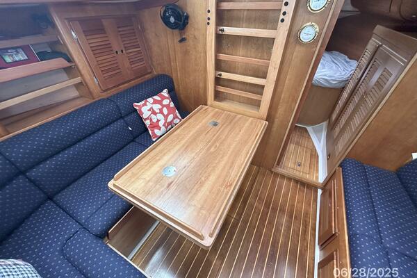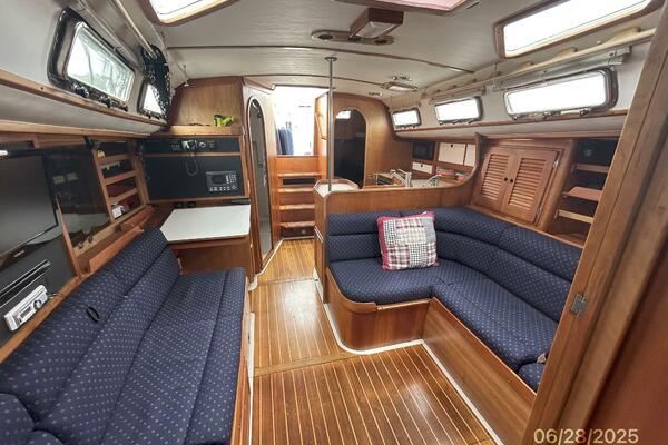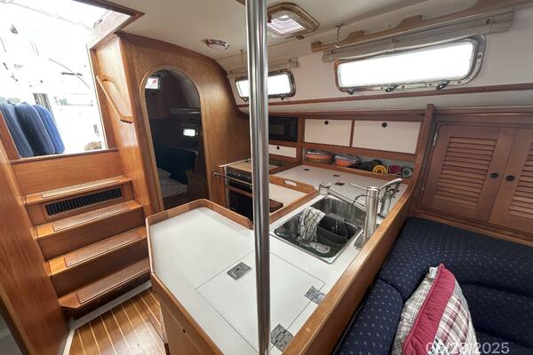 From the fiberglass swimplatform, you step up through the transom pass-thru into the cockpit and find seating and storage on each side and aft, helm pedestal and bimini & dodger. She offers wide side decks and clutter-free decks. Walk forward and step down through the companionway into the salon and you will find a stateroom with a queen size berth port aft, galley to port, l-shaped seating with storage port forward, folding fold-up table forward, head with enclosed shower starboard aft, nav station to starboard and a benchseat with storage starboard forward. Continue forward to find a stateroom with v-berth and insert and ensuite head forward. Auxiliary access is via removing the companionway stairs.