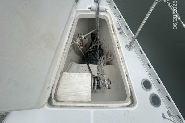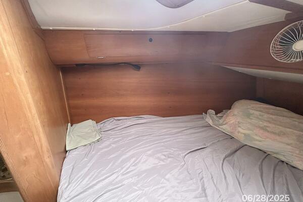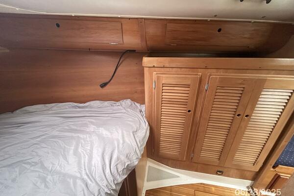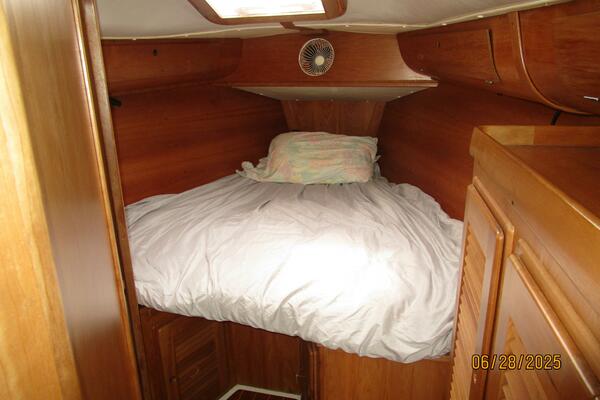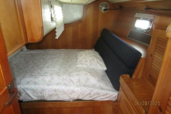 The aft stateroom offers a queen size berth, 3 portlights with shades, fan, reading light, storage cabinets, hanging locker, teak & holly sole and privacy door.