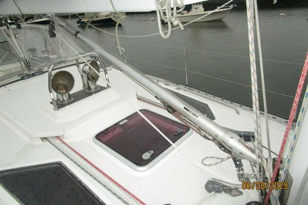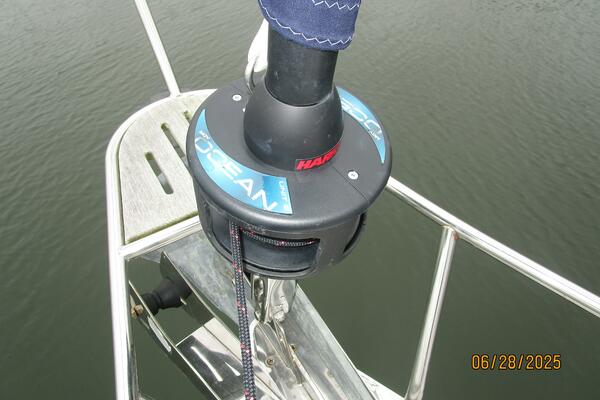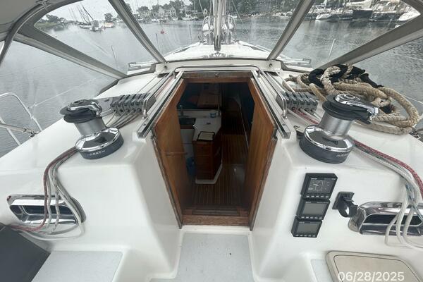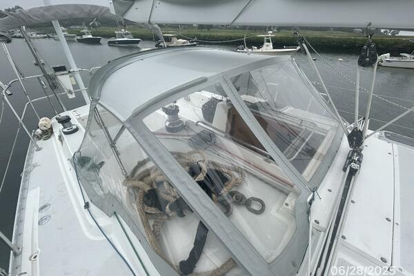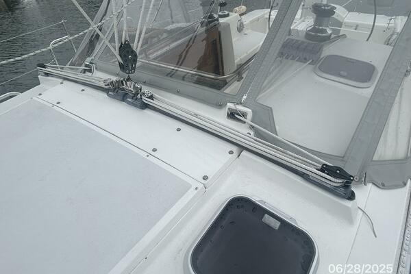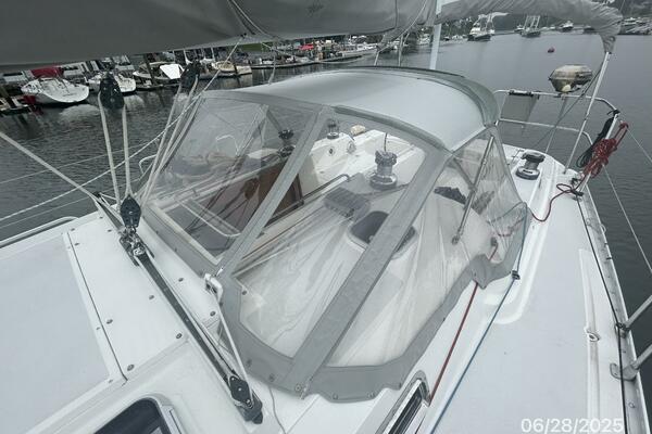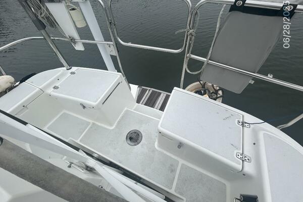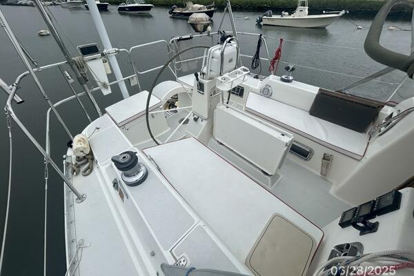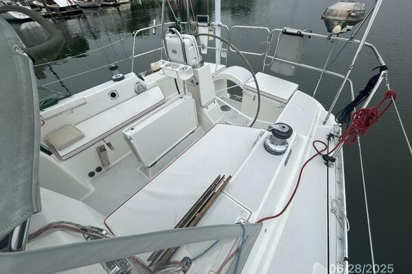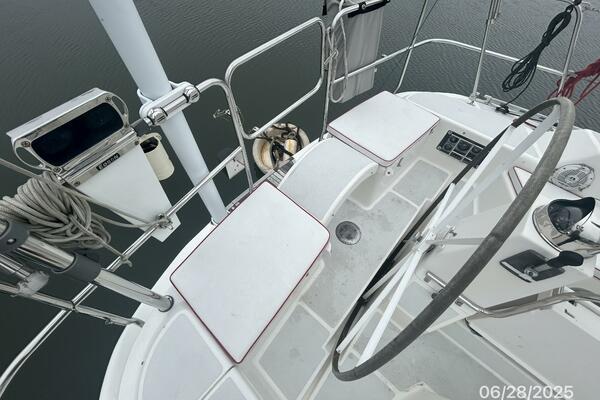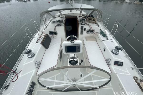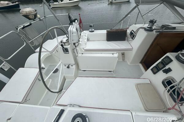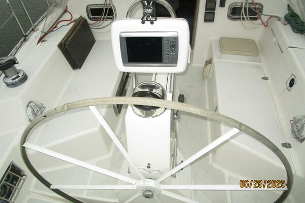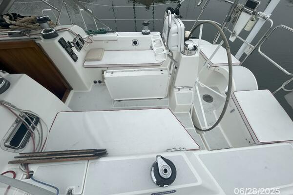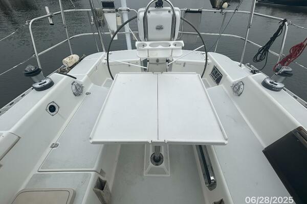 The cockpit offers a non-skid deck, bimini, dodger, transom pass-thru to the swimplatform, seating with storage on each side and aft, fold-up table, Magma stainless steel BBQ grill, electronics as detailed in the electronics section in this presentation and winches and rope clutches as detailed in the sails and rigging section.