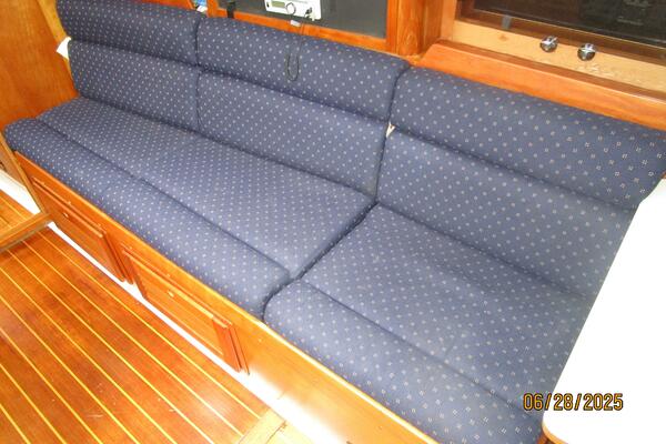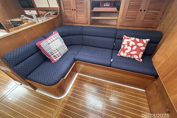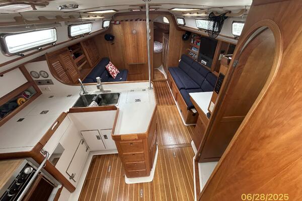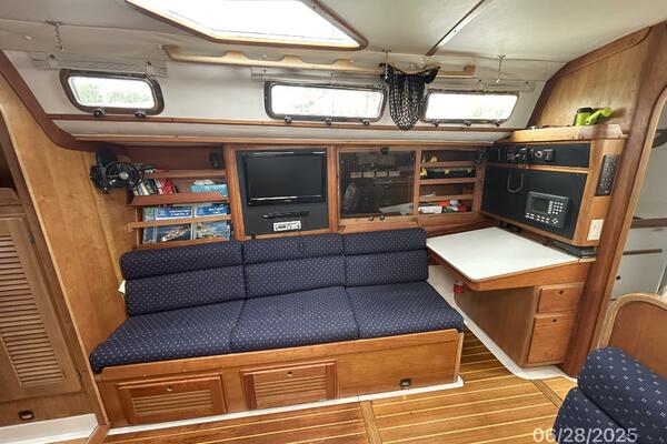 The salon offers a folding, fold-up table forward, teak & holly sole, L-shaped seating with storage that converts into a double size berth port forward, benchseat with storage to starboard, shelves, cabinets, fans, 7 portlights with shades, 2 overhead hatches with screens, 2 overhead windows, reading lights, Hitachi flat screen TV, Sony stereo, nav station and auxiliary access.