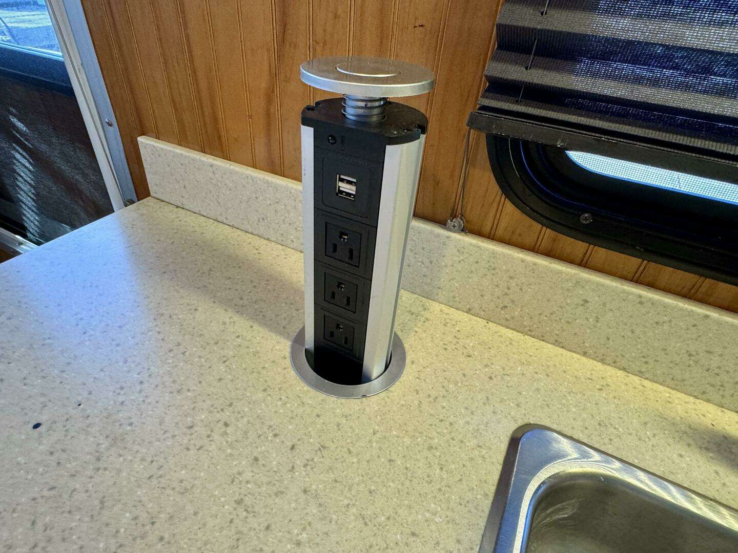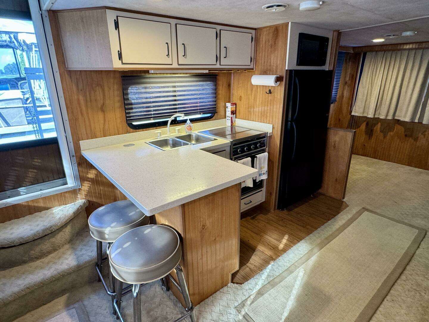 To starboard of the dinette and aft of the helm is an L-Shaped updated countertop with 2 bar stools, recessed power outlets, a double stainless sink, an electric 3-burner oven/range, electric refrigerator/freezer, integrated microwave, and several cabinets.