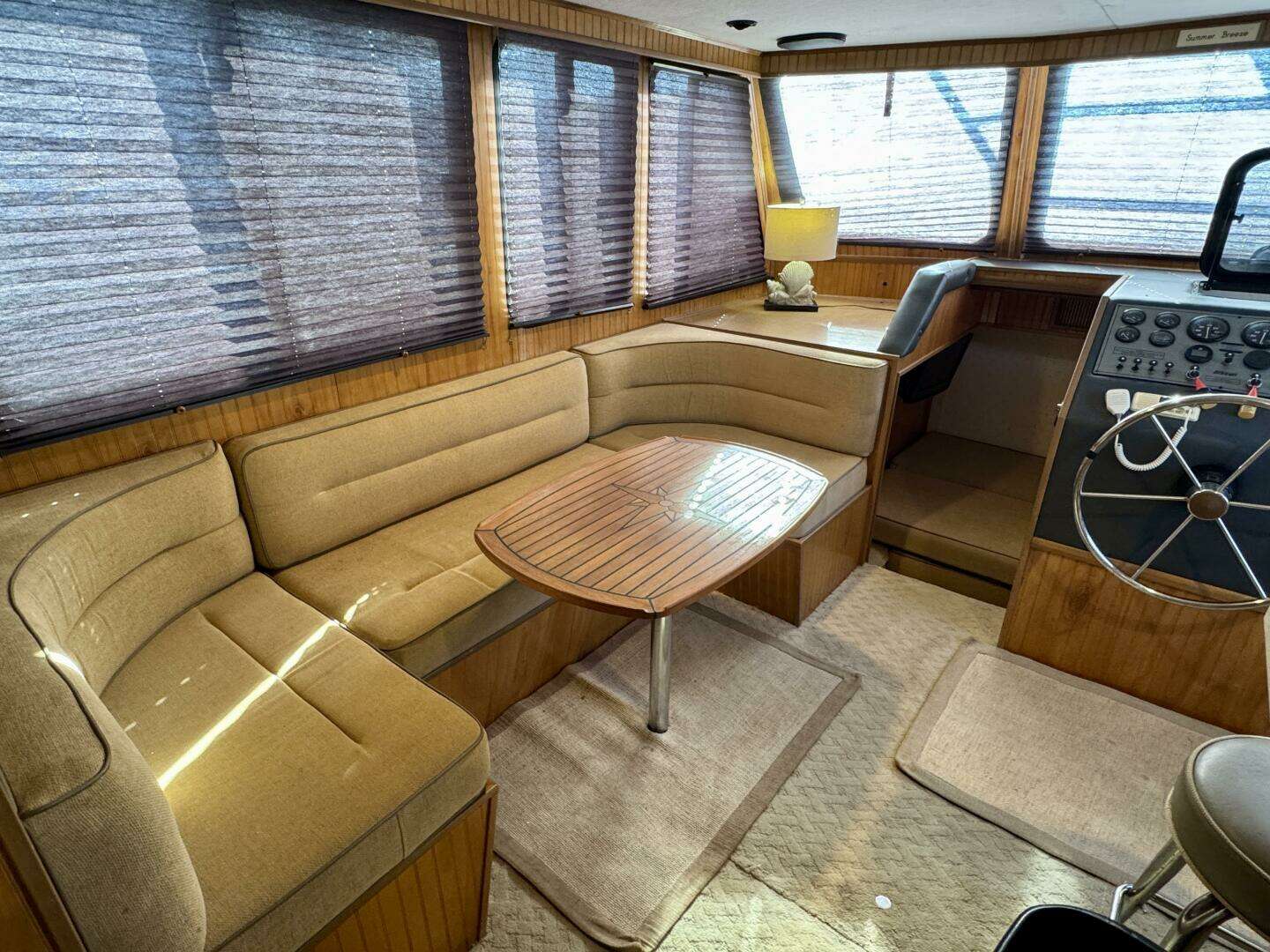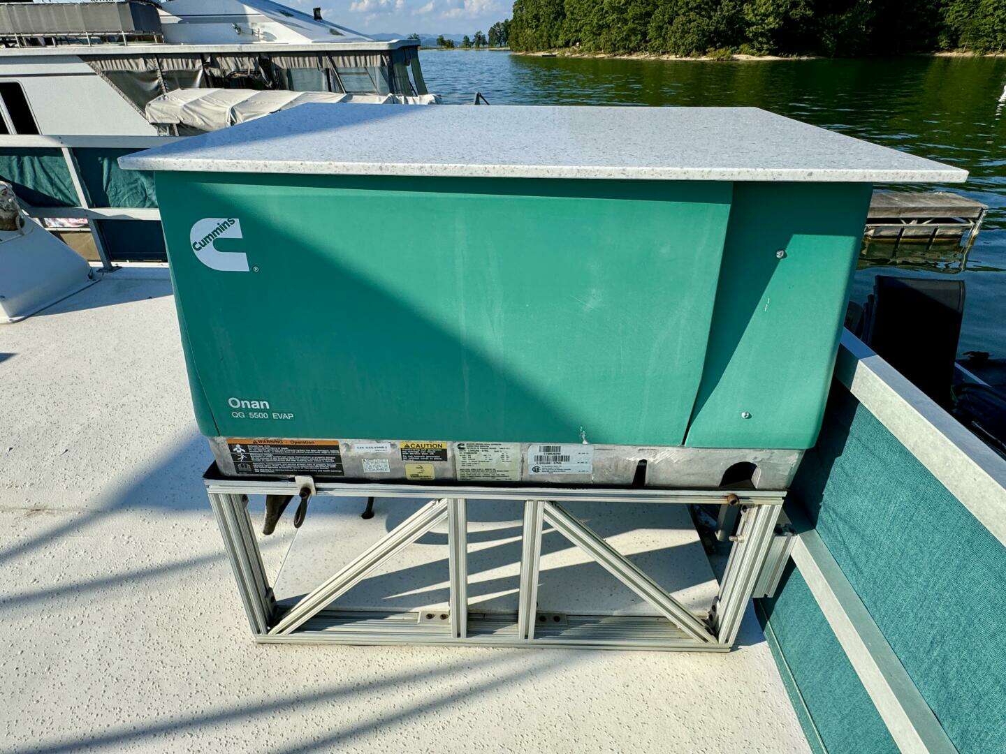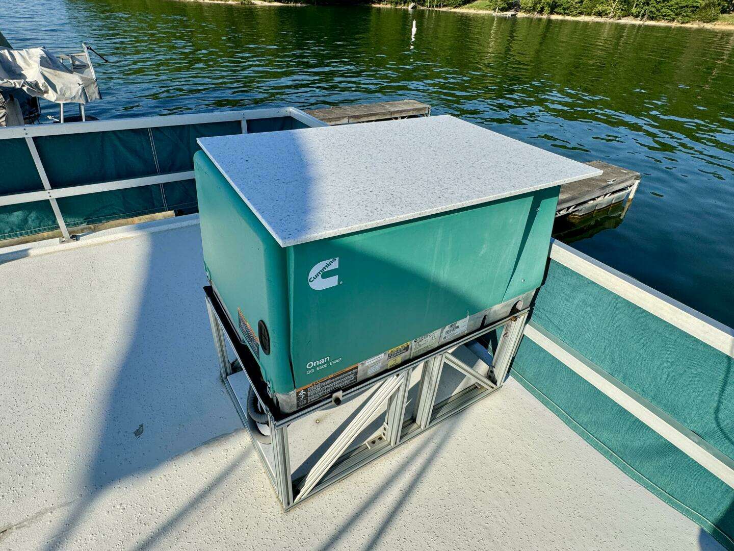 A small staircase just forward and port of the engine hatch will lead you up to the sun deck where you'll find a newer 5.5Kw Onan Cummins Air-Cooled RV Quiet Gasoline generator that is equipped with a remote start from the main cabin. Moving forward towards the bow on the upper level you'll find a large flybridge with wrap around seating for 10 with three functional stereo speakers, an 8' sunbrella bimini top, and the upper helm complete with full controls, a vhf radio, engine instrumentation, and remote spotlight controls.