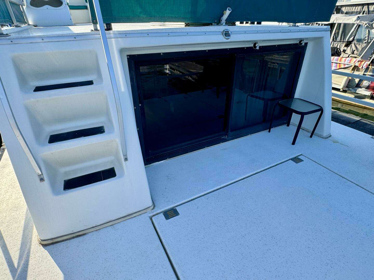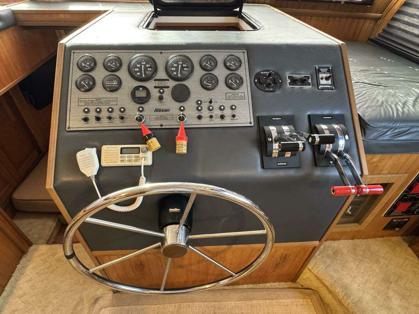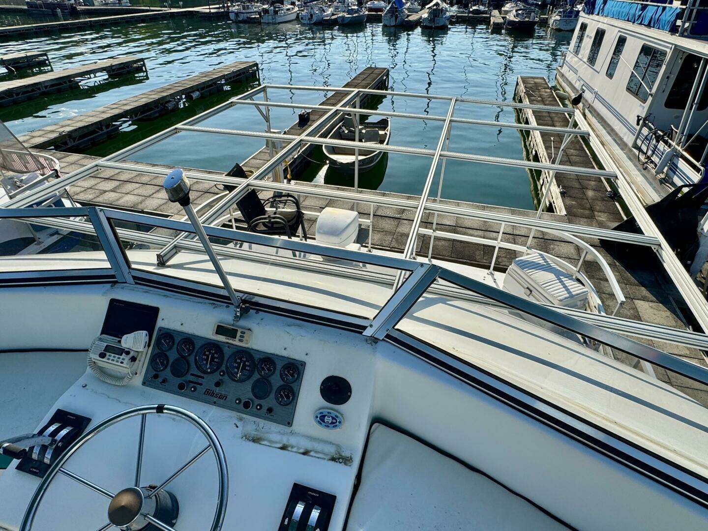 A small staircase just forward and port of the engine hatch will lead you up to the sun deck where you'll find a newer 5.5Kw Onan Cummins Air-Cooled RV Quiet Gasoline generator that is equipped with a remote start from the main cabin. Moving forward towards the bow on the upper level you'll find a large flybridge with wrap around seating for 10 with three functional stereo speakers, an 8' sunbrella bimini top, and the upper helm complete with full controls, a vhf radio, engine instrumentation, and remote spotlight controls.