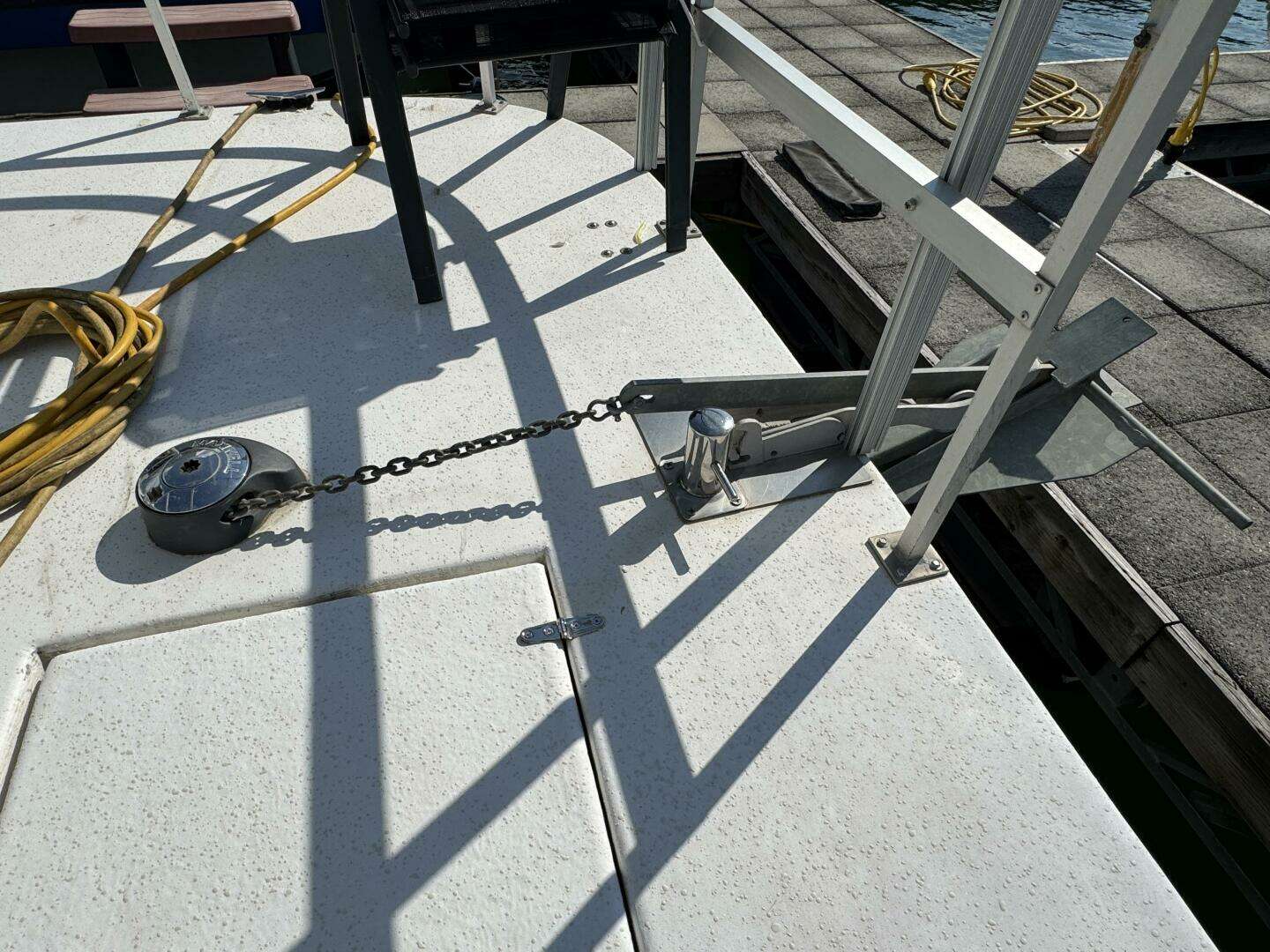 A custom aluminum framed shade cover is overhead at the bow, a large integrated bench seat just forward of the cabin has a removable seat cushion, 30amp shower power and dockside water connections are integrated along with a maxwell windlass anchor and storage locker underfoot.