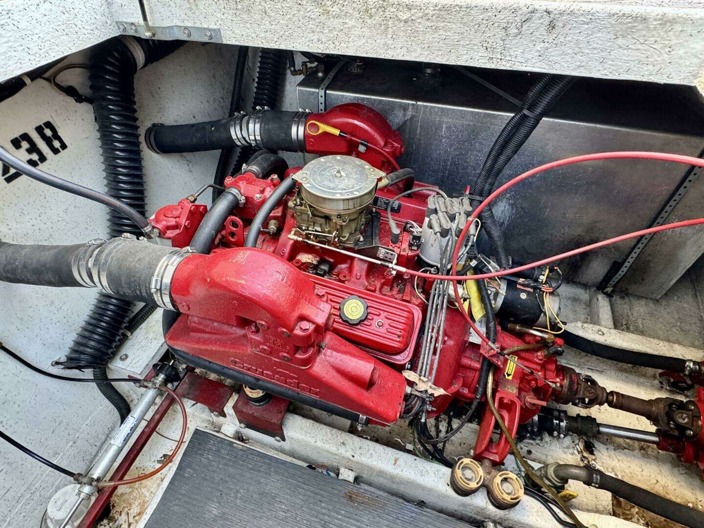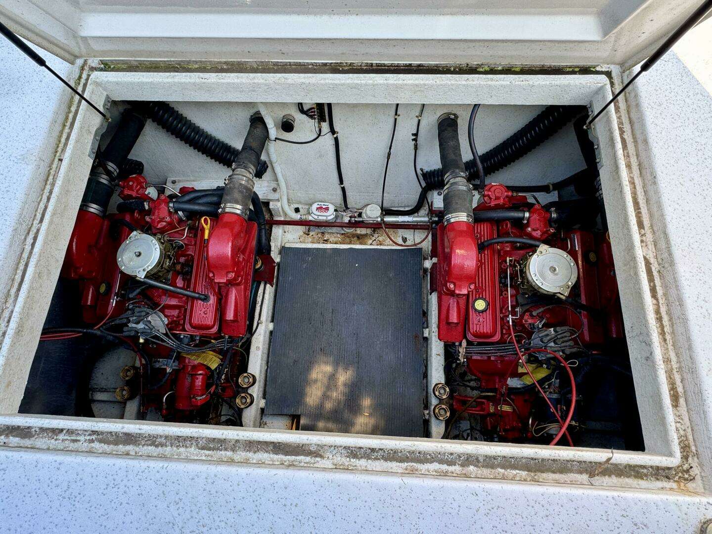 Removable steps allow for exiting the cabin to the rear deck where you'll find the engine hatch underfoot and a pair of 5.0L Crusader 305CID inboard v-drive engines, a pair of aluminum fuel tanks, onboard battery charger, and three marine batteries.