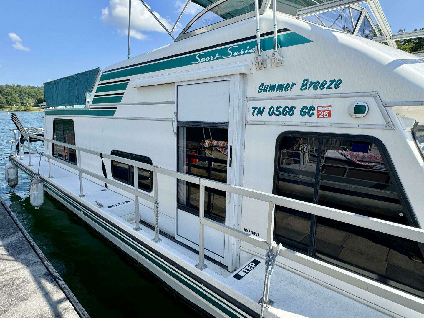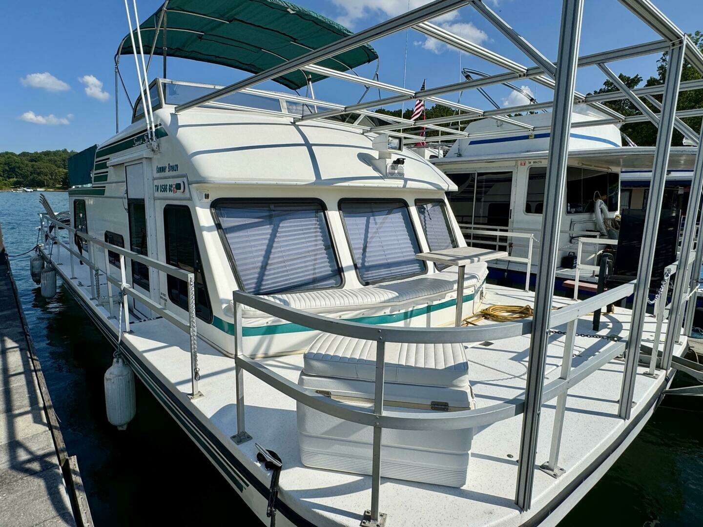 This 1995 Gibson 37 Sport Series Fiberglass Hull Houseboat For Sale on Cherokee Lake in East Tennessee is equipped with twin 5.0L Crusader counter-rotating 305CID inboard V-drive engines and features a 5.5Kw Onan air-cooled RV generator with remote start, a maxwell windlass anchor, an aluminum framed bow shade cover, a roof-mount ducted central air conditioning dometic RV-style AC unit, an electric refrigerator/freezer, 3-burner electric oven/range, microwave, a convertible dinette, forward cuddy berth, and room for a master bed in the aft, plus a full head with a vanity sink, marine head, and walk-in shower.