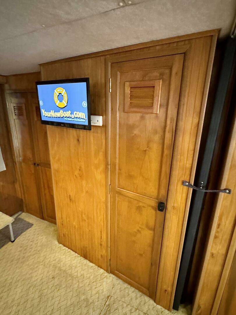 Forward of the dinette and just to port of the lower helm is the forward cuddy with a full size berth, hanging locker, 19'' TV with integrated DVD player and a hatch overhead to allow for more air flow.