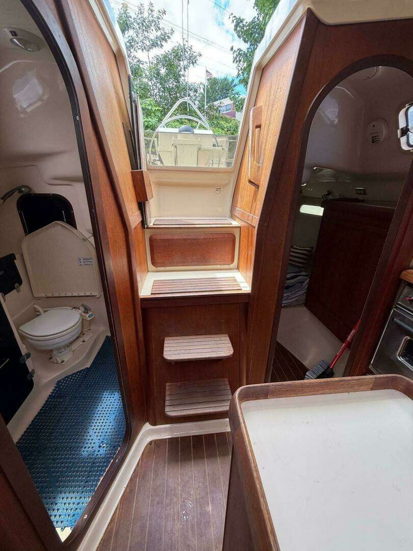 Down below is bright and airy with newly refinished teak veneer cabin sole. The main salon is wide and spacious, with a large u shaped settee to port and an open V-berth cabin with curtains. The aft cabin has an oversized Queen bunk and plenty of storage. The galley has a double burner gimballed stove, two sinks, ice box, ample storage, and built in glass and cup rack. Across form the Galley is a nice sized head with shower. The water lines and water heater are new.