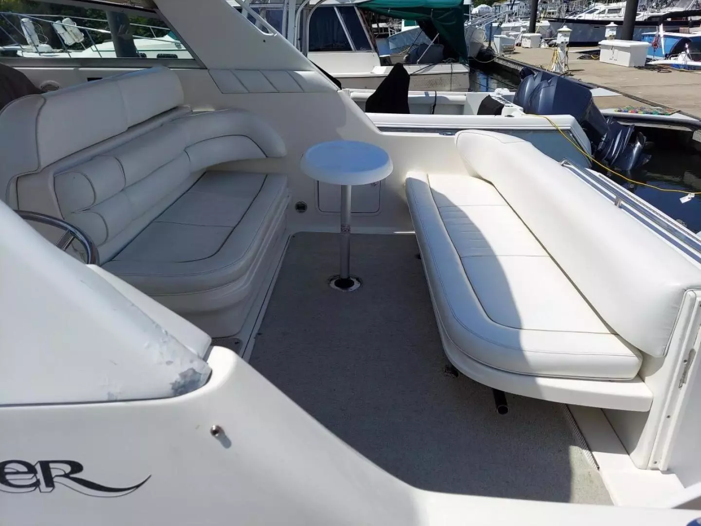 Forward you have an offset double bed with a small seating area, opening ports, ventilation hatch and hanging locker. Aft to starboard is the convertible dinette area. Aft to port you have a built in TV followed by the spacious galley area followed by the enclosed head. Aft again to the aft cabin that features U-shaped seating and converts to a queen bed. Up a couple of steps to the helm deck with a double helm seat and the helm to starboard. On the port side you have a forward-facing companion seat followed by a wet bar. Aft again to the cockpit area you have a double rear facing bench seat and an aft bench seat. A transom door is to port for access to the swim platform and the transom storage.