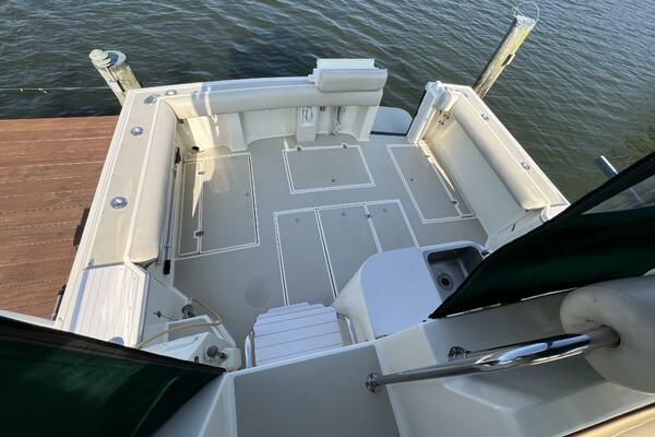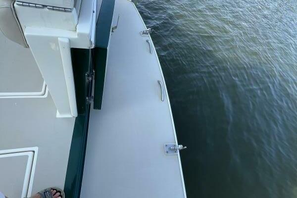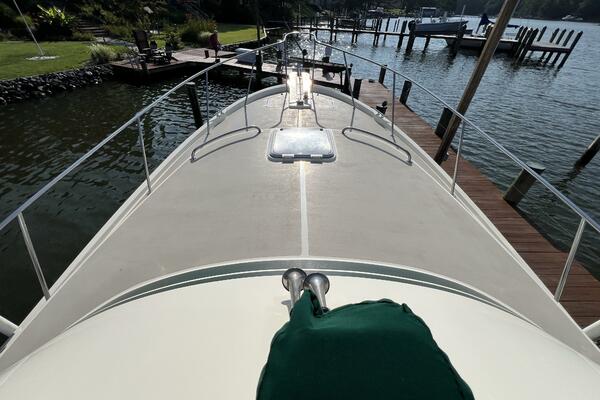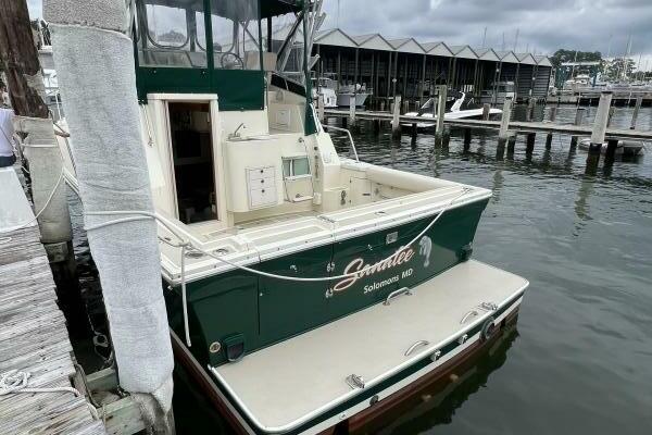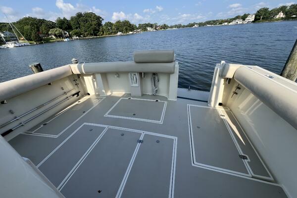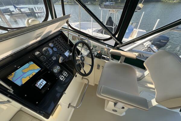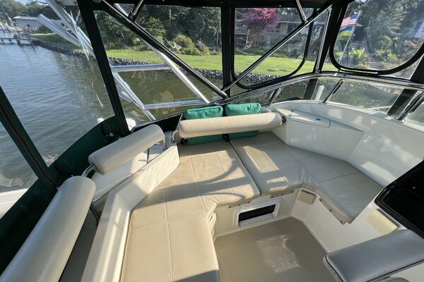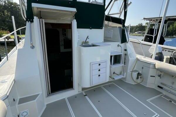 - As one leaves the interior you enter the large cockpit. There is plenty of room for chairs and tables or leave it open for fishing. Engine access is via the hatches in the cockpit sole. On the forward bulkhead is a wet bar or fish cleaning station. There are steps both port and starboard for easy access to her side decks. 3 steps lead up to the command bridge which also offers a large U-shaped settee to port and helm station to starboard. This area is fully enclosed with a canvas bimini and removable plastic windows. She also has an aluminum Radar arch aft of the bimini. Nice solid stainless steel rails guide you to her bow in comfort.
